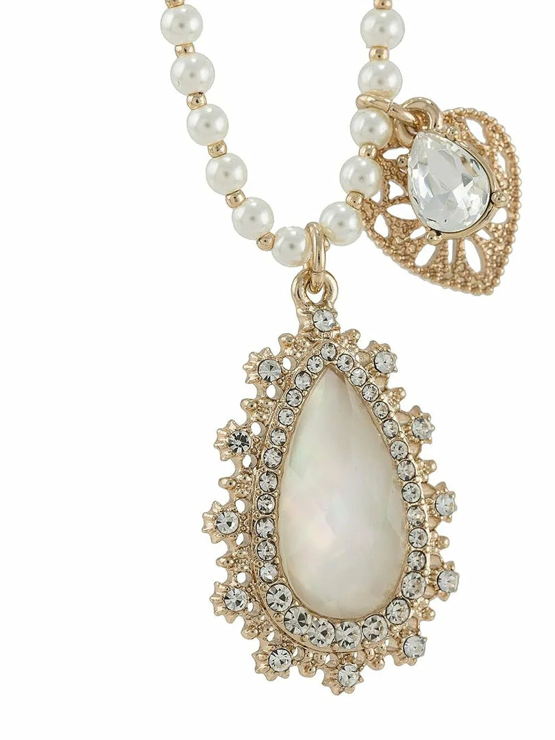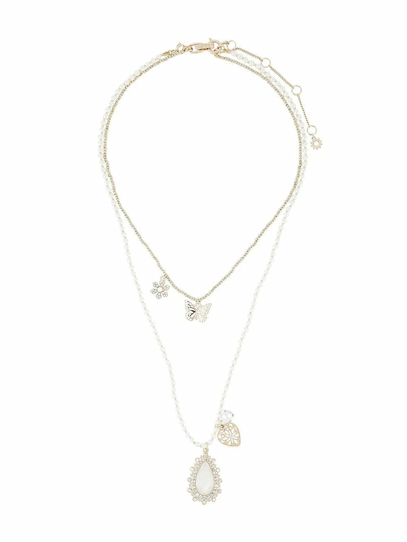Butterfly Layered Pendant Necklace in gold features dainty butterfly and heart details, crystal pendant accents, and pearl embellishments.