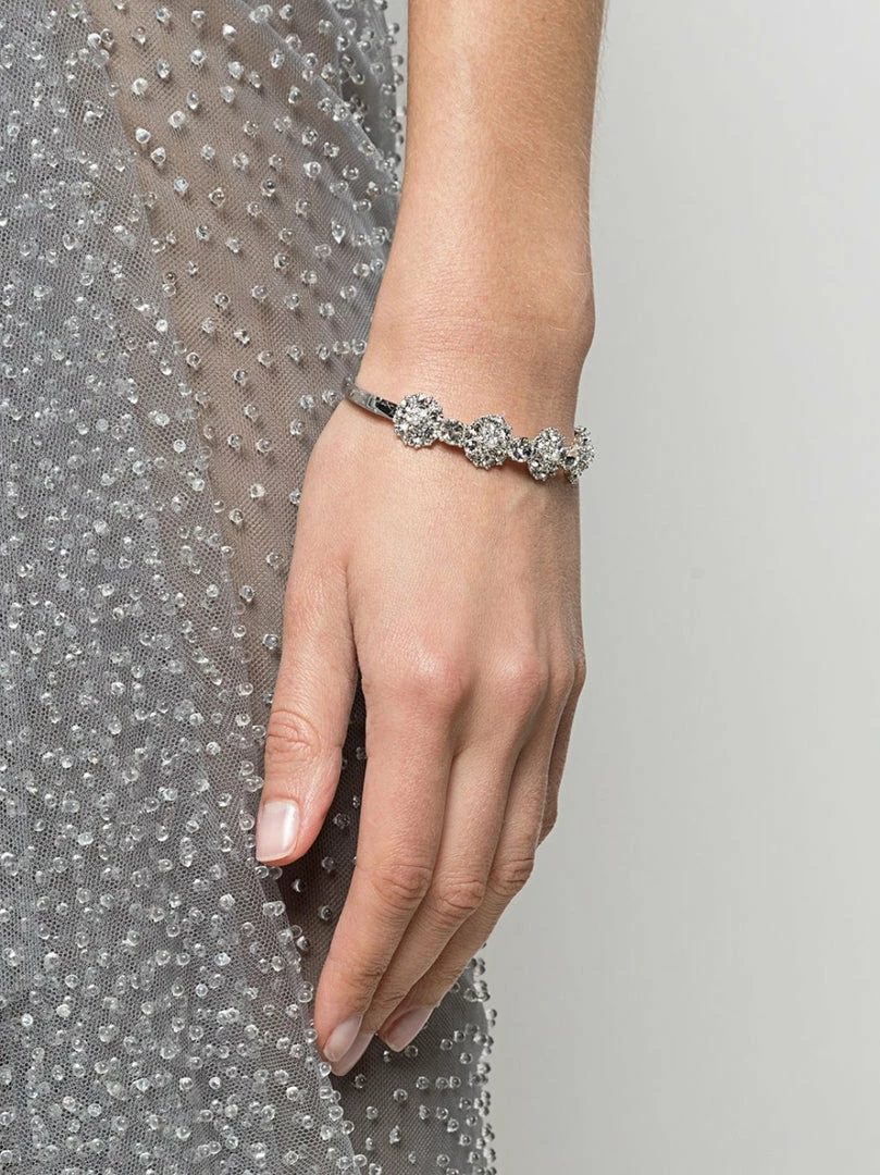 Add a perfect touch of sparkle to your evening attire with this cluster crystal bangle in rhodium, featuring large circular crystal embellishments on a structured bangle bracelet.