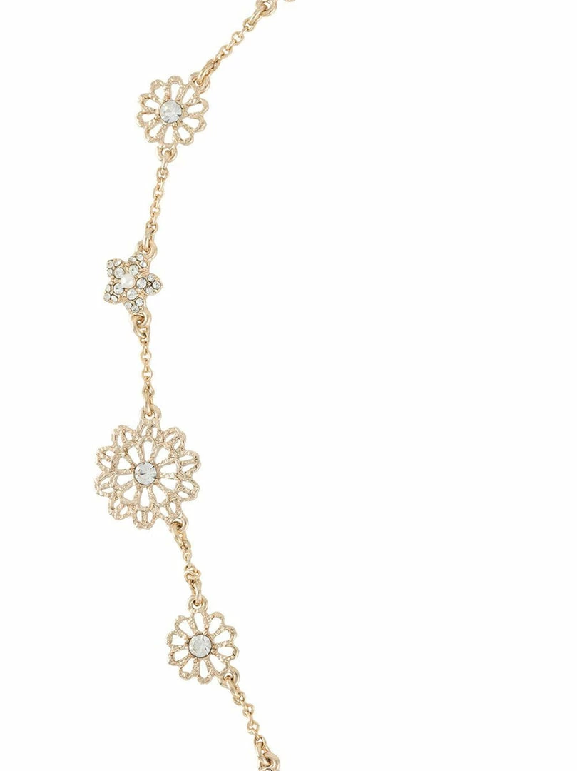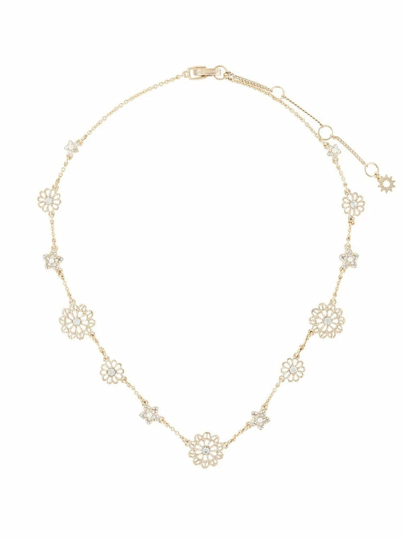 The Crystal Embellished Floral Star Detail Necklace features white encrusted crystals in a floral and star design on a dainty short gold rolo chain with adjustable fit and clasp fastening.