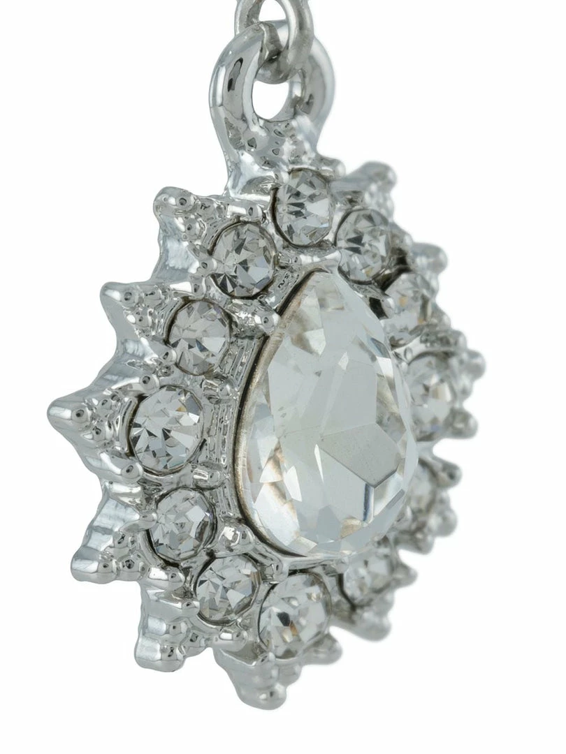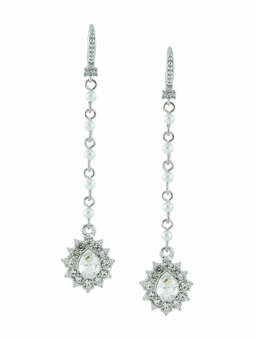 Crystal pendant drop earrings features a dainty silver chain with pearl accents, a dropped sparkling crystal pendant, and a hook fastening.