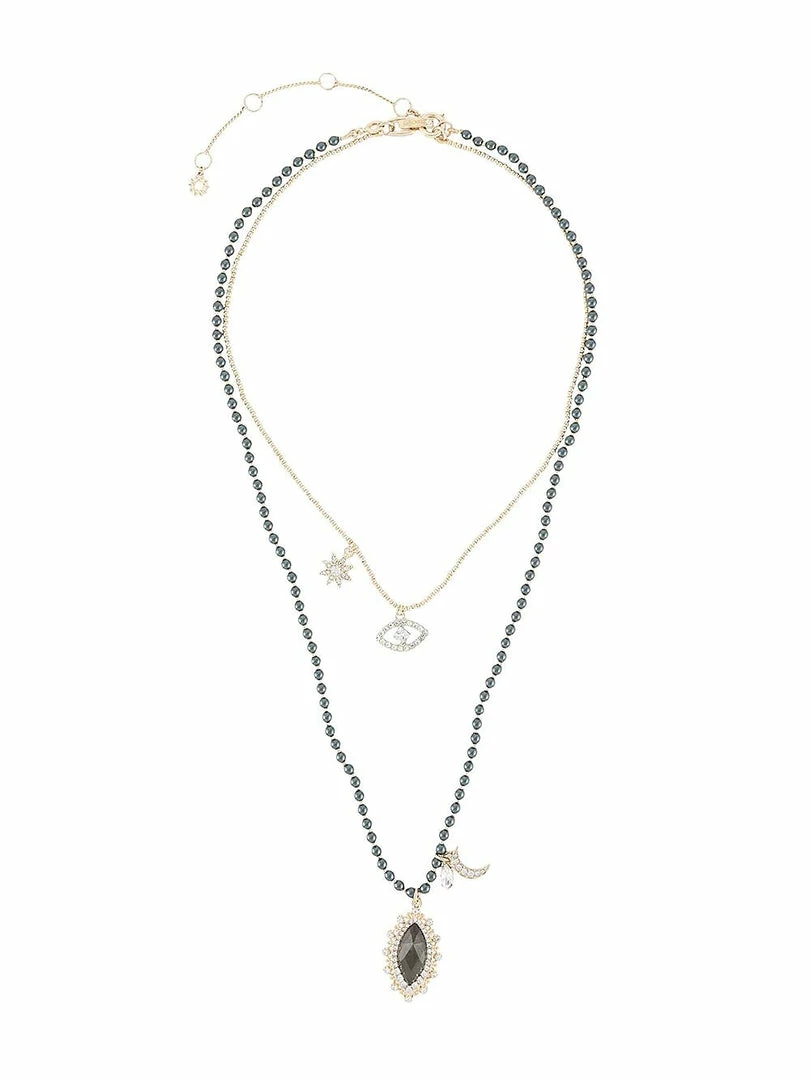 The Evil Eye Layered Pendant Necklace features a dainty gold chain with crystal encrusted evil eye and moon charms, and a long chain necklace with black faux pearl detailing and an oval stone cut pendant.