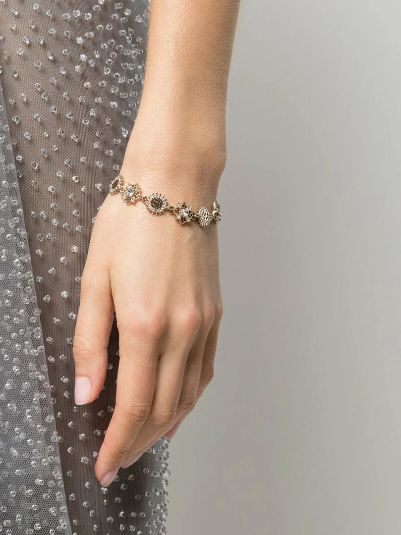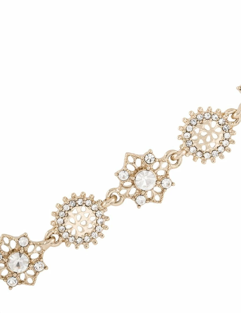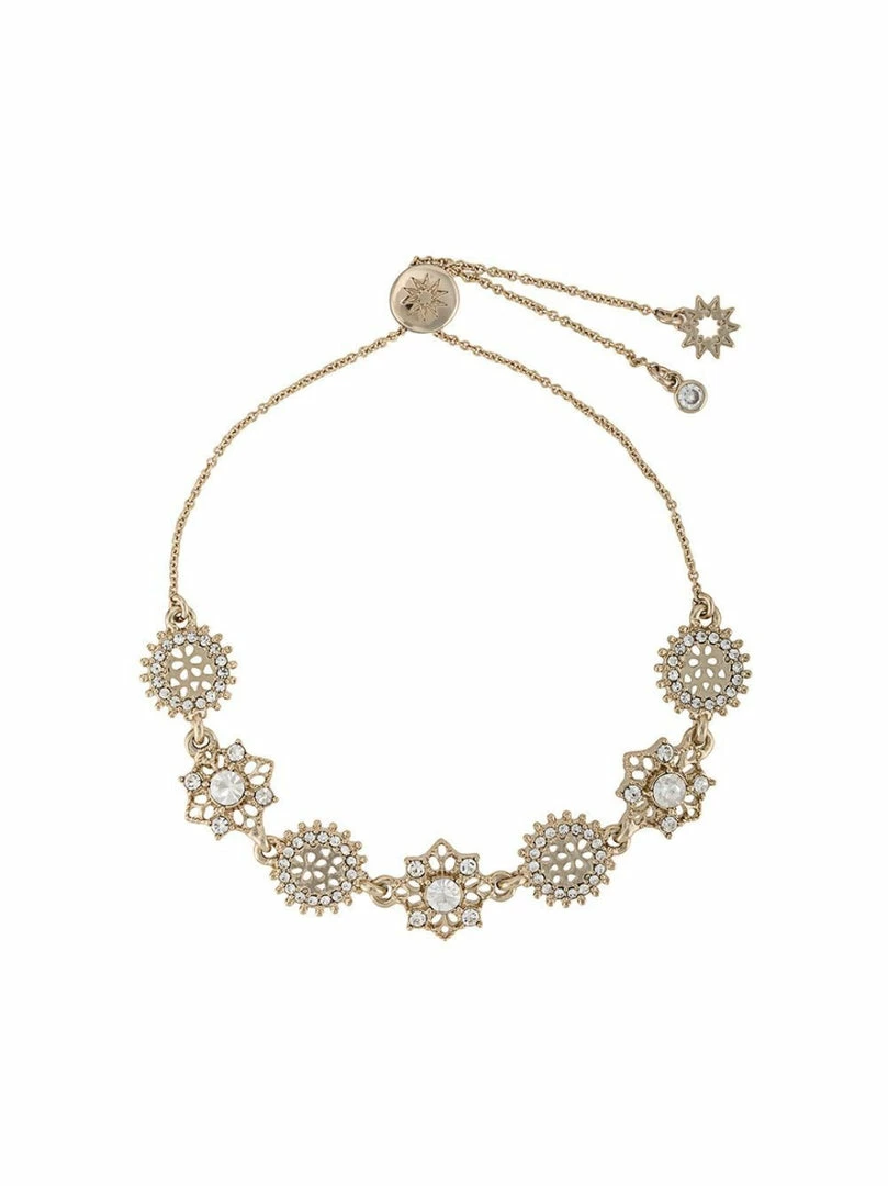 The Filigree Charm Slider Bracelet features gold and crystal encrusted charm embellishments bracelet with a slider clasp.Â