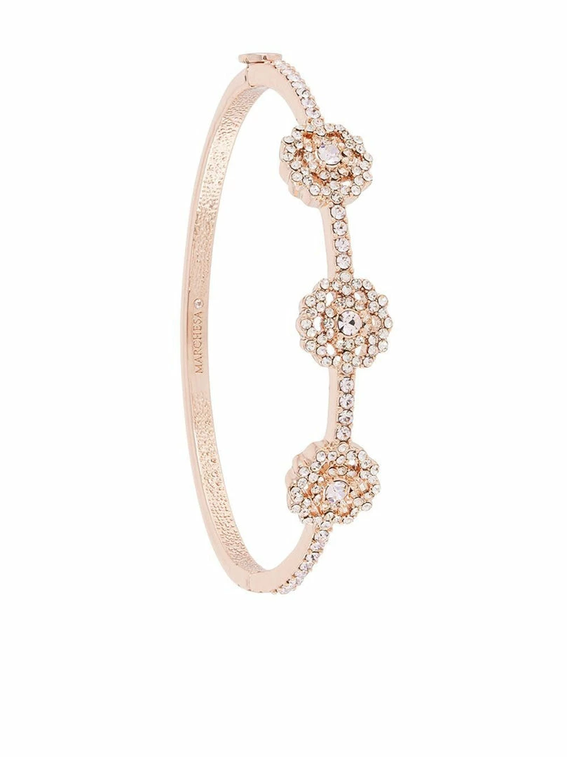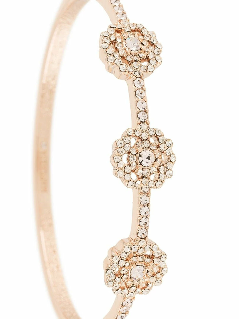 Add some sparkle to your look with the Floral Charm Bangle Bracelet featuring crystal encrusted flower embellishments with rhodium plating and our engraved logo.