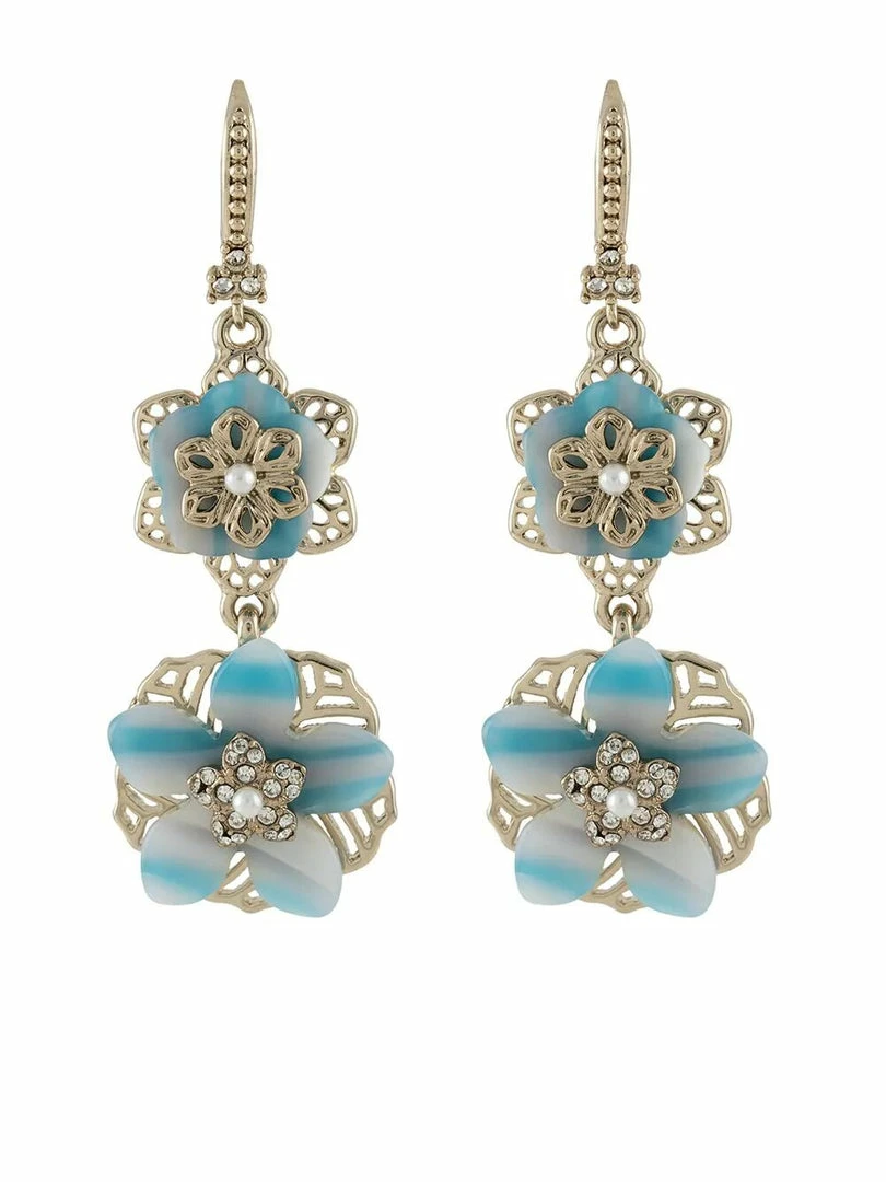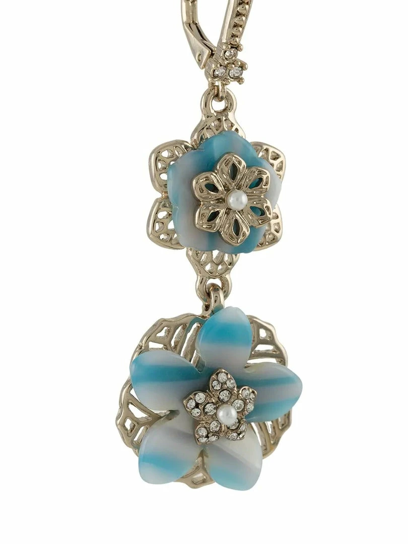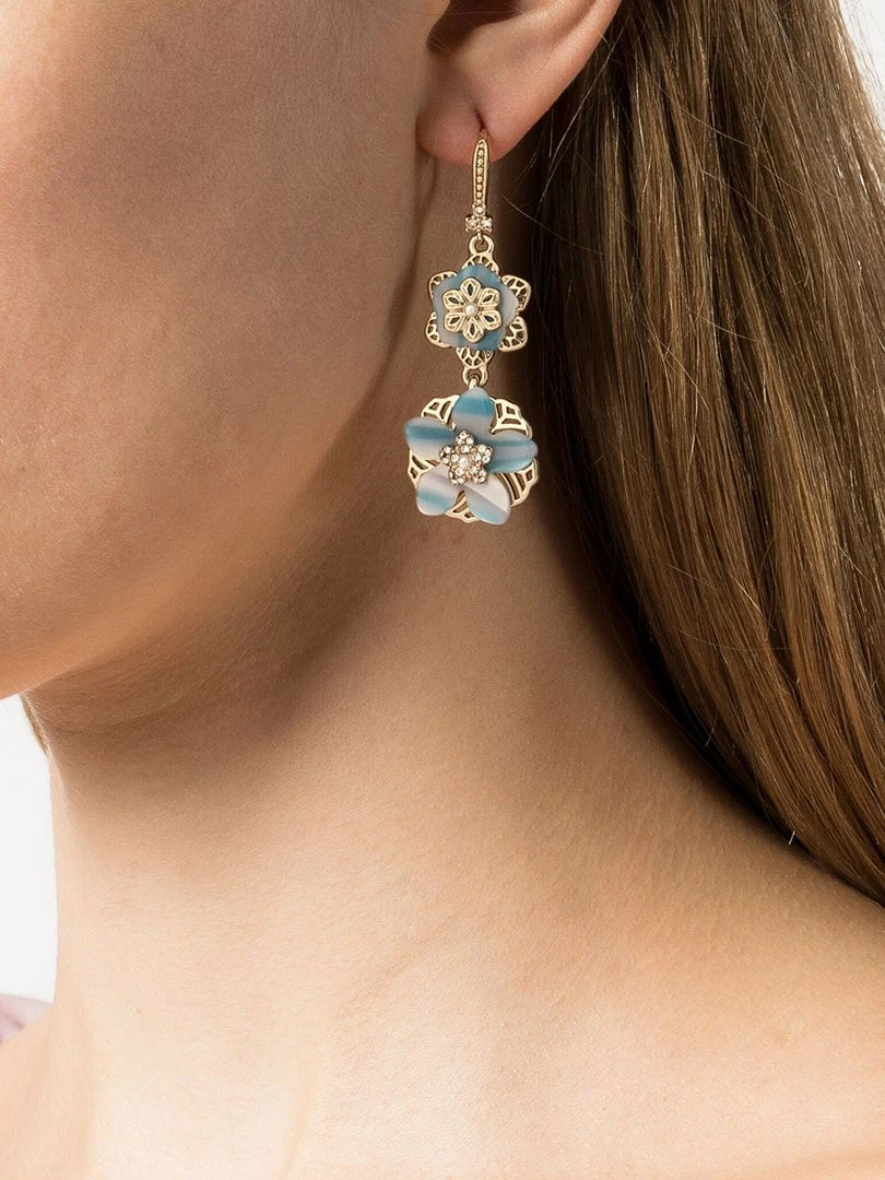 The Flower Double Drop Earrings feature gold filigree floral details with blue and white tone stone accents in an elegant drop design.