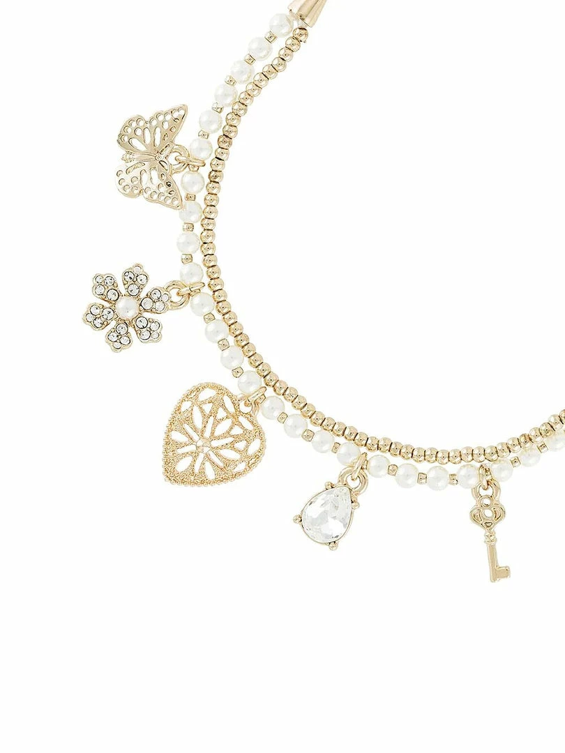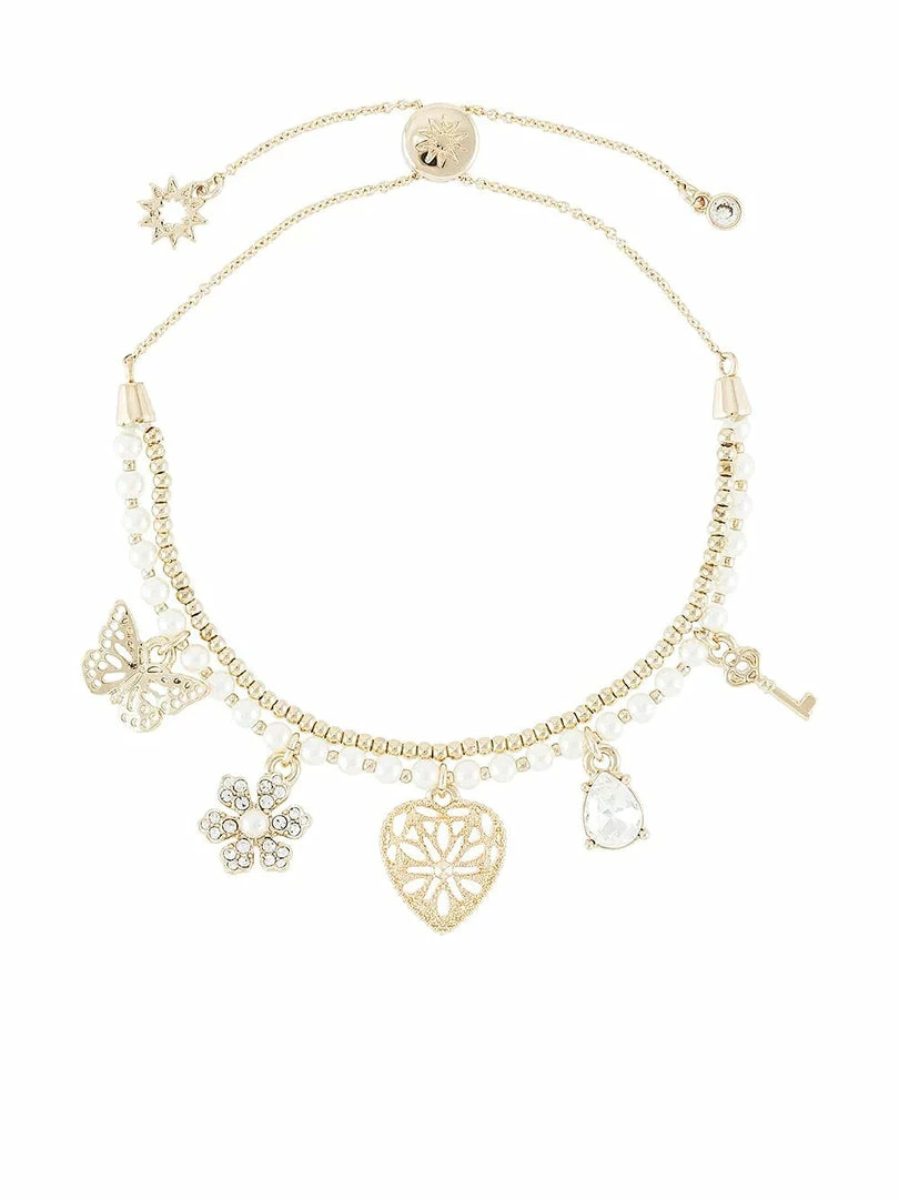 Elevate your everyday with the Heart Charm Layered Pearl Slider in gold, featuring delicate butterfly, flower, and crystal encrusted charms on a dainty gold chain with a pearl accent layer and adjustable slider.