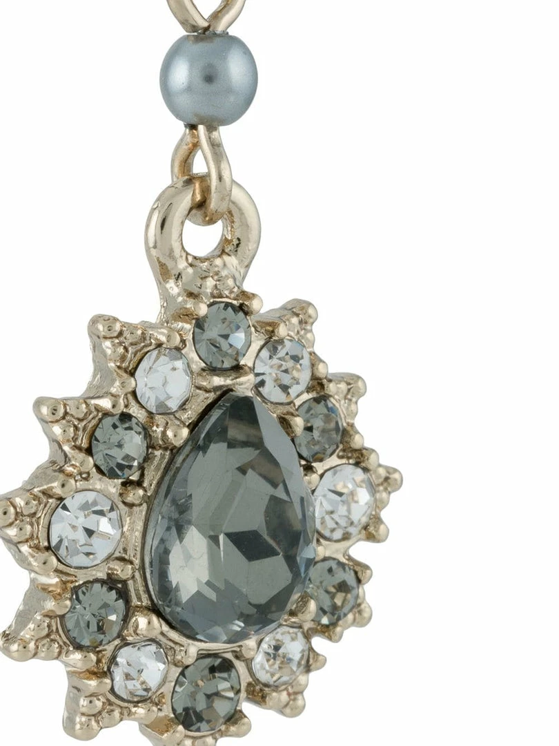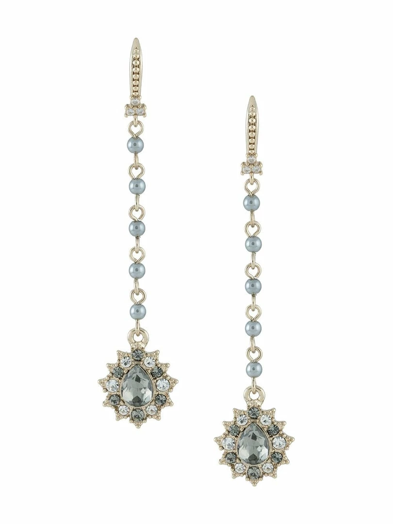 Crystal embellished long drop earrings feature blue grey tone crystals on a delicate gold and faux pearl chain to create an elegant addition to any look.Â