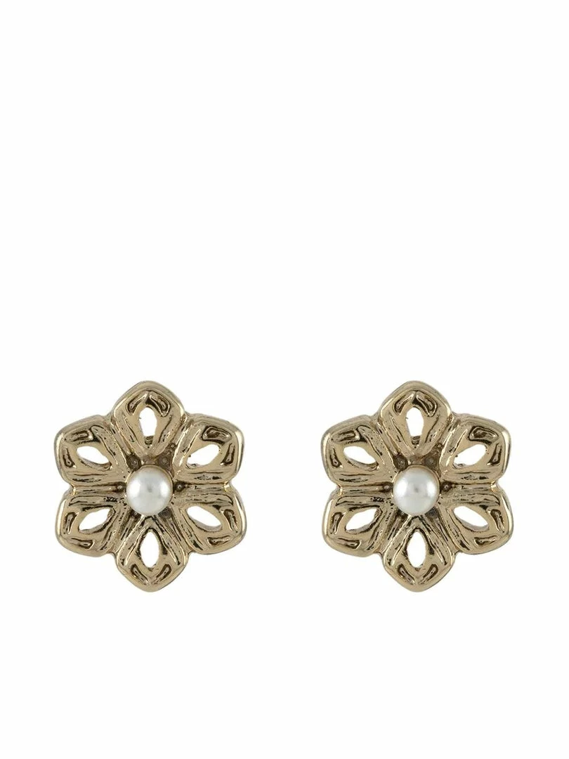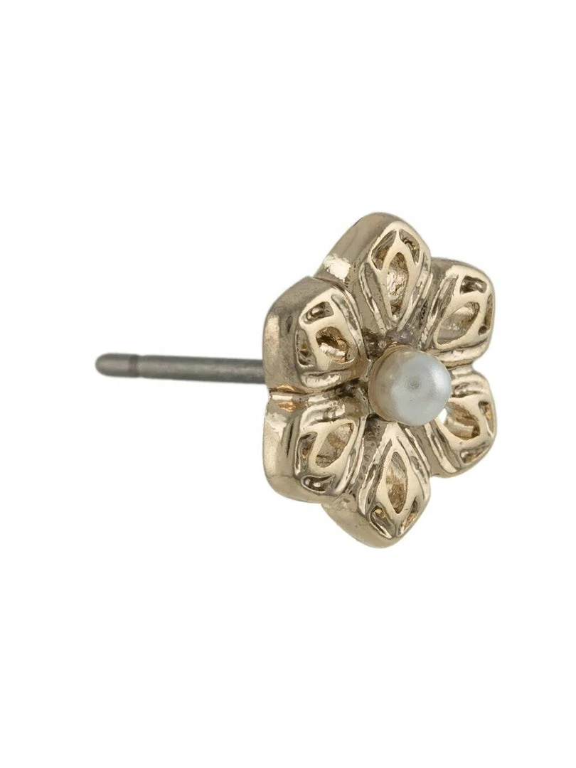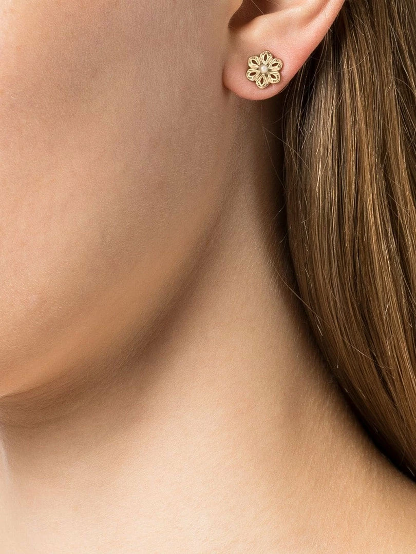 Elevate your everyday with the Flower Button Stud Earrings, featuring gold tone filigree floral designs with a pearl accent.