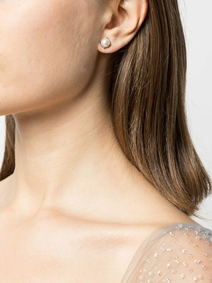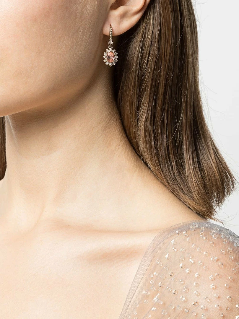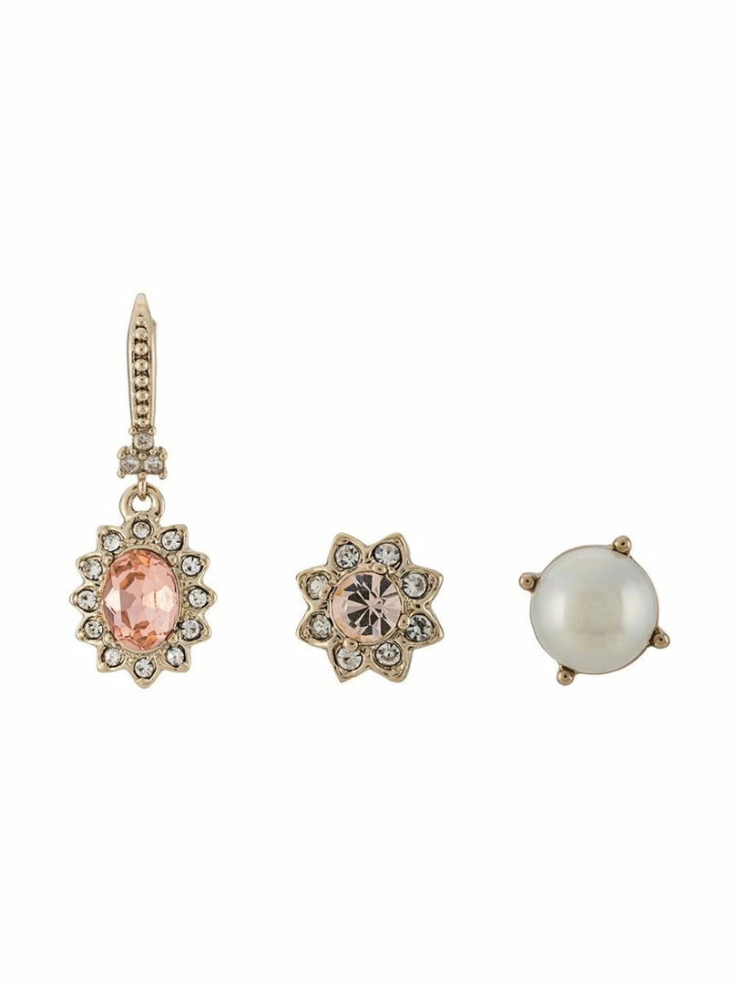 Gold, Blush and White tone earring trio set featuring an oval cut pink stone drop earring with a crystal encrusted floral stud and a pearl accent stud.