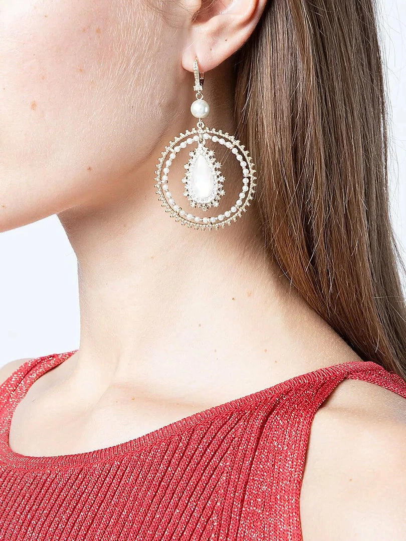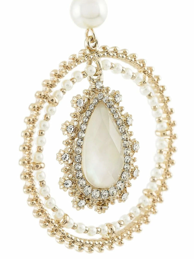 Elevate any look with the Pear Crystal Orbital Drop Earrings featuring a pear-cut white stone encrusted with crystals and a gold and pearl accent orbital.