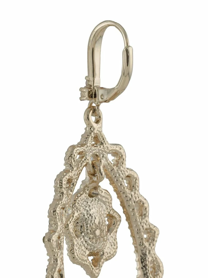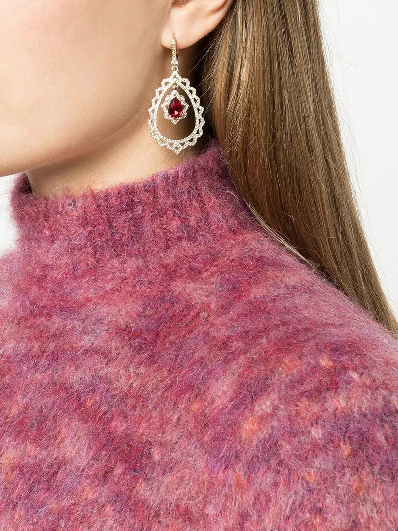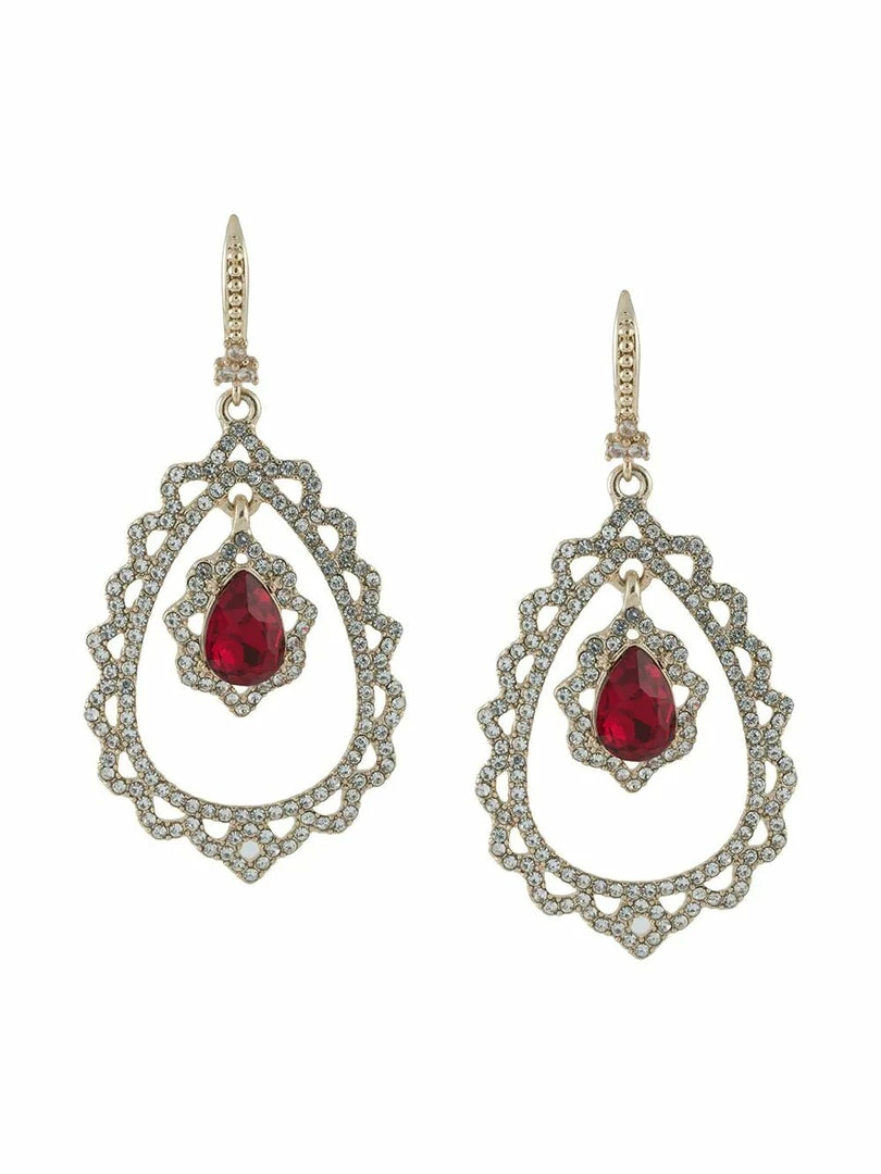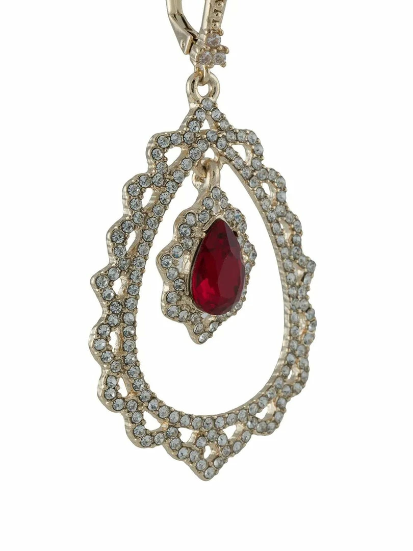 The Pear Stone Orbital Drop Earrings in red feature a crystal encrusted oval orbital drop design with a ruby pear cut stone crystal inside.Â