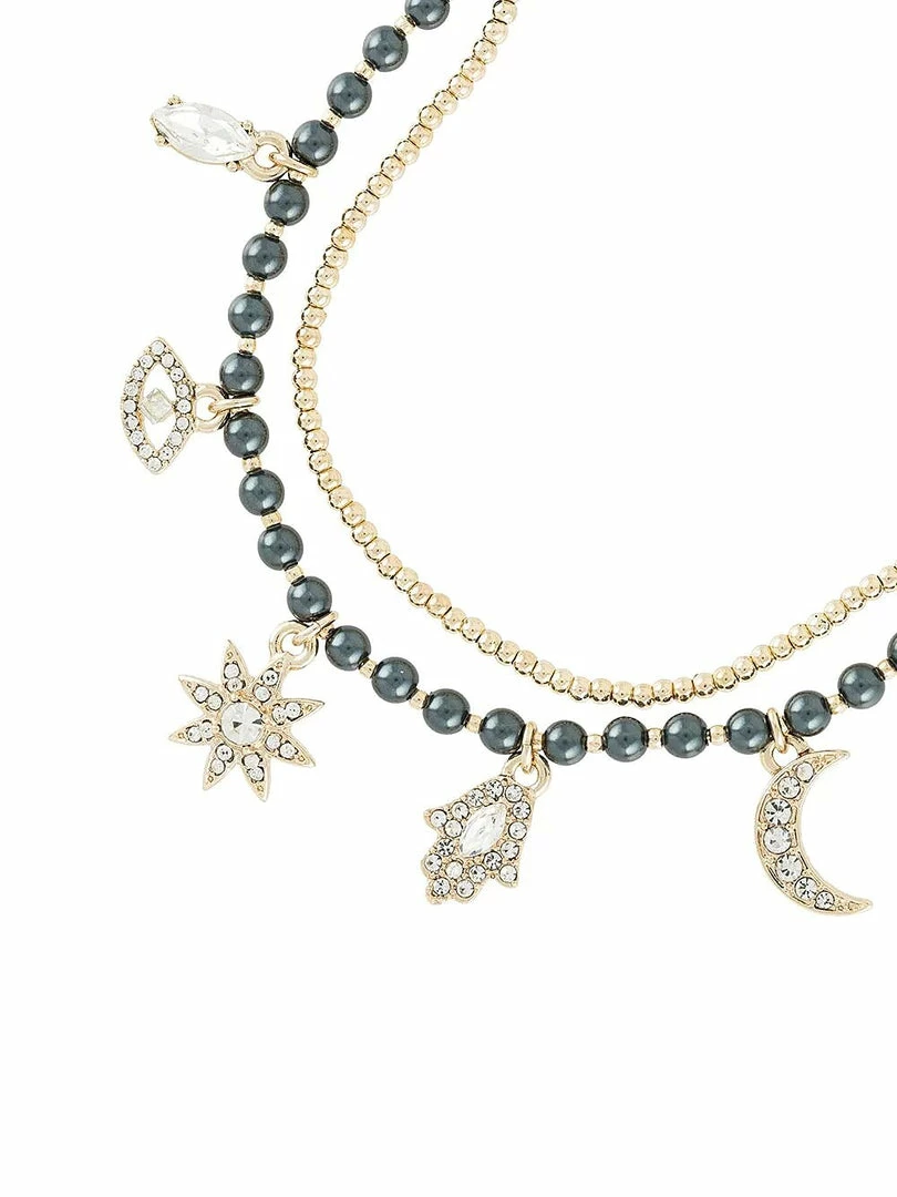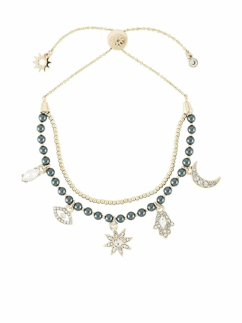 Star Charm Slider Bracelet features a layered dark pearl chain with crystal encrusted evil eye, star, hamsa, and moon charms on a gold adjustable slider bracelet.