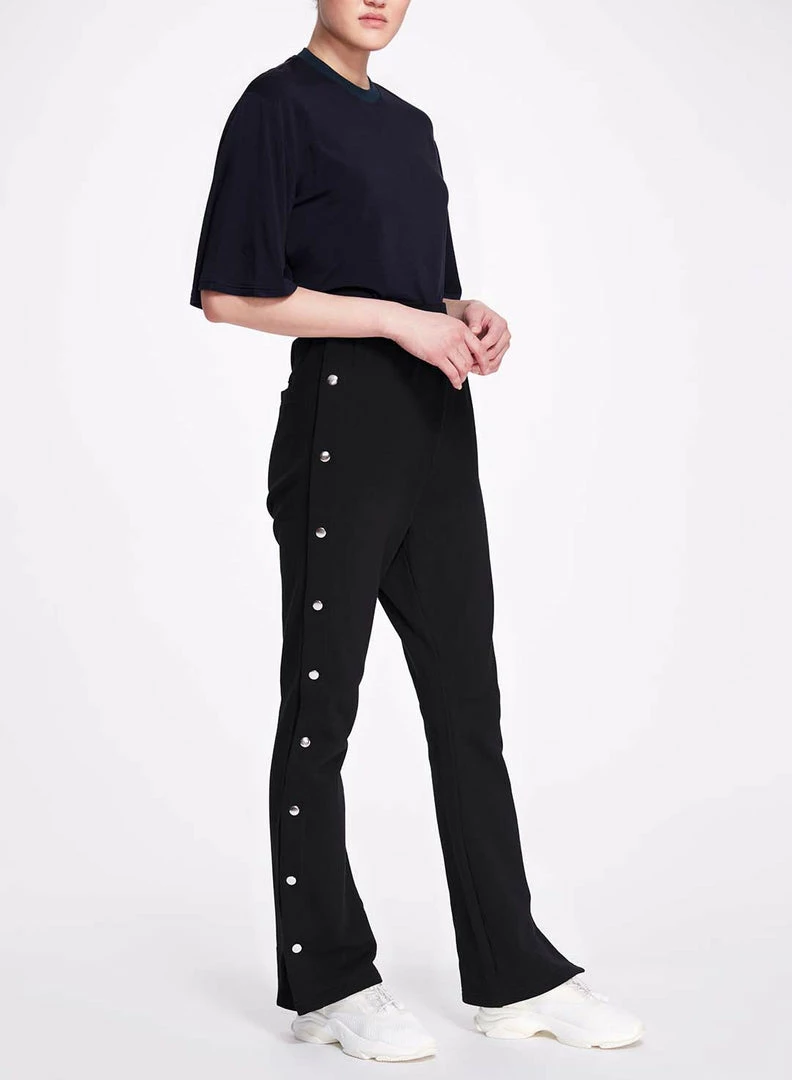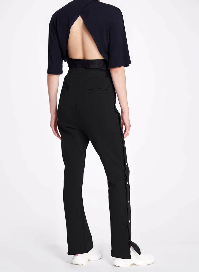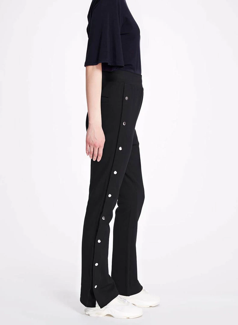 Super soft french terry sweatpants in black with elastic waistband, slant pockets., embroidered bow detail on back, relaxed fit and tearaway sides with silver snap closures.Â