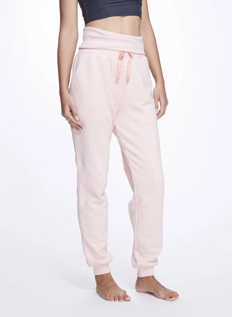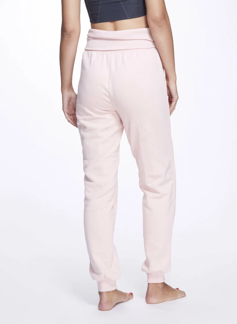 The Laila Sweatpant features super soft fleece jersey, contrasting cord trim at sides, pockets, fold over waistband with drawstring ribbon, relaxed fit, elasticized rib at bottom leg.