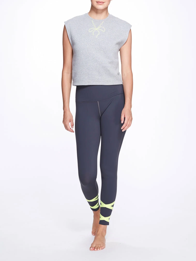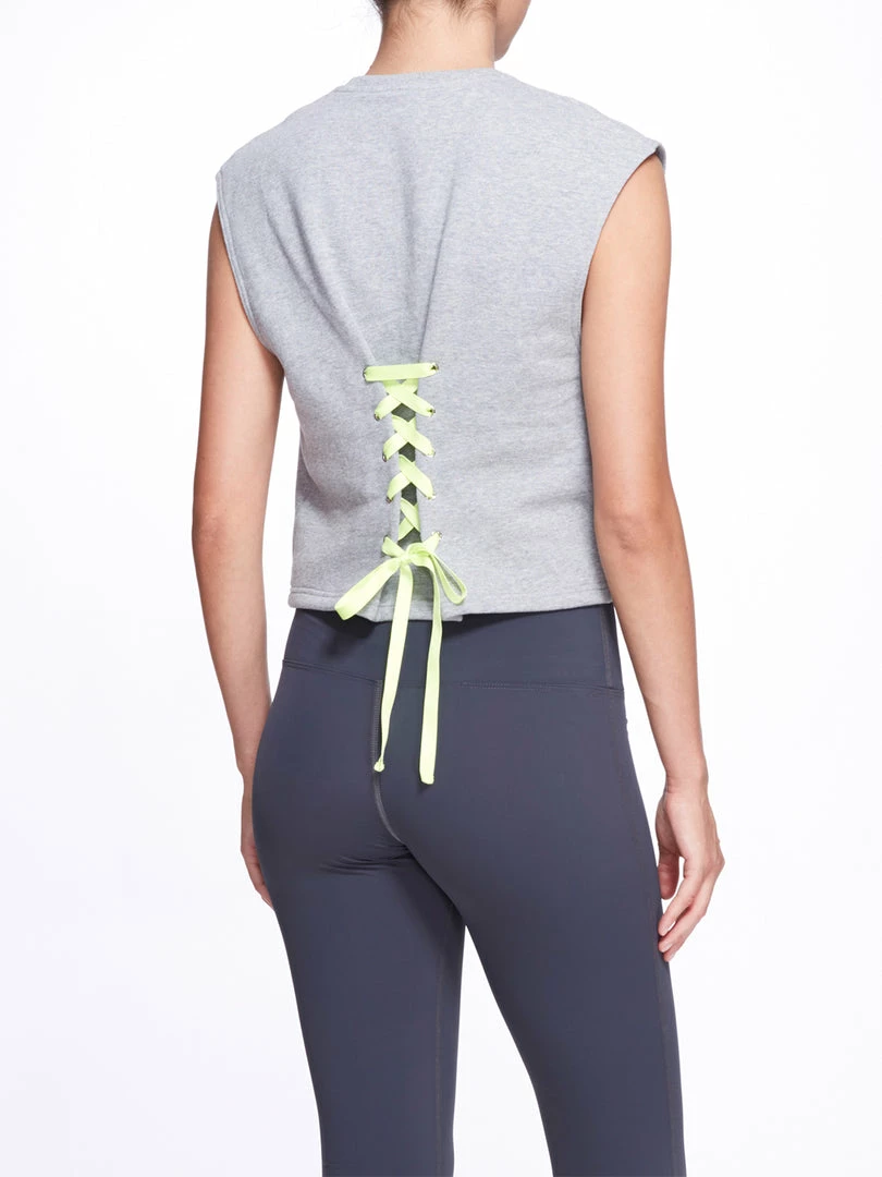 The Sue Top features a sleeveless design. Super soft fleece jersey, crew rib neckline with embroidered bow detail, cinch lacing detail in back, tip of shoulder sleeve fit, relaxed cropped fit.