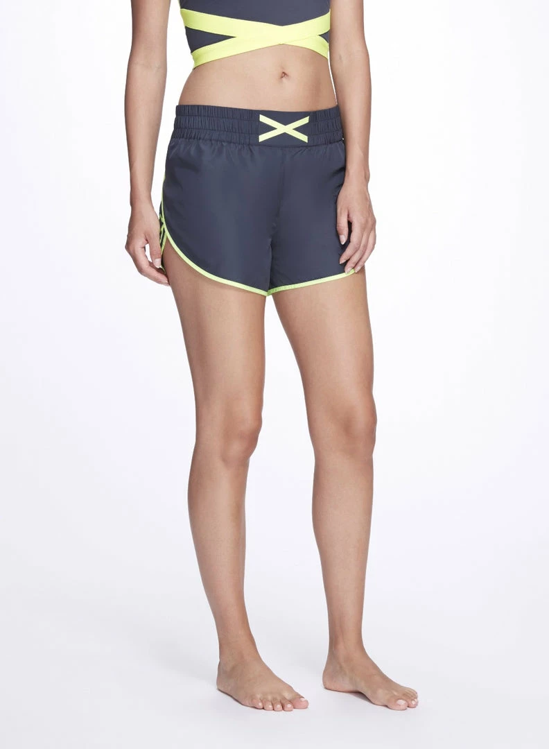 The Althea Short features a short length, a cinched waist. Super lightweight performance outer fabric, elasticized wide waistband with contrasting x detail, zipper pocket at back, contrasting trim binding, half bow embroidery at side, soft interior lining.