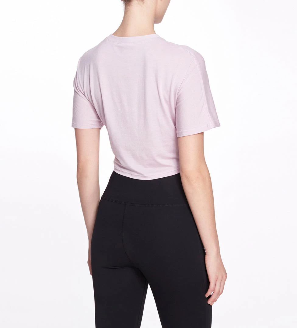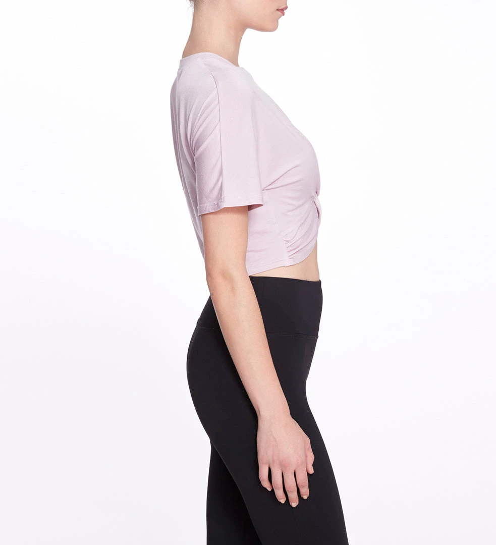 Super soft short sleeve athleisure top with front twist detail and relaxed cropped fit. Is suited for any type of activity. The Amelia tee is light, breathable, and flexible.Â