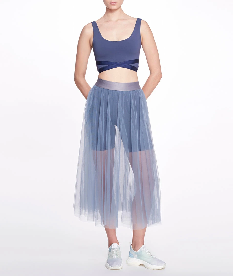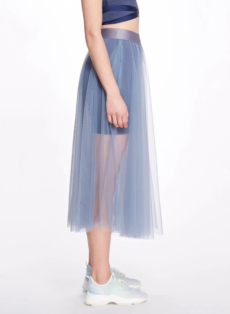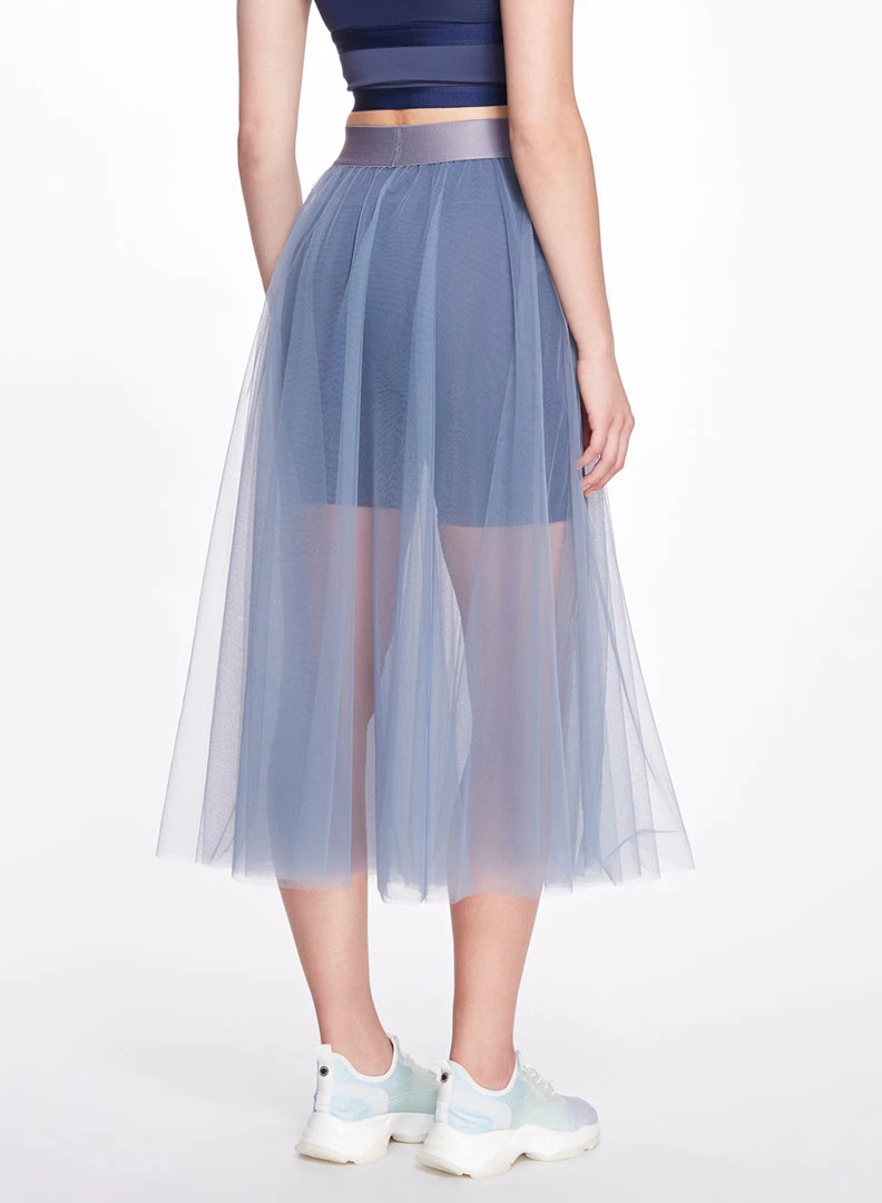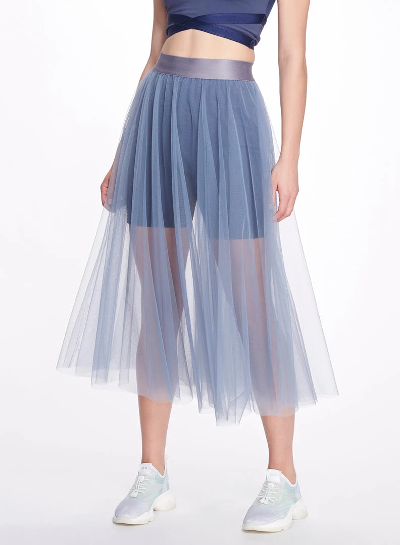 The Anne Skirt is a faultless tea-length addition to a layered look, featuring tiered weightless tulle, and a wide elastic waistband creating a high rise look. This is an extremely versatile garment; it is perfect for dance-related exercise, such as barre, or dance classes, and can also be worn as an everyday skirt, paired with running shorts or leggings. The sheer, tulle material adds a romantic and graceful element to this garment that extends its wear outside the gym.Â