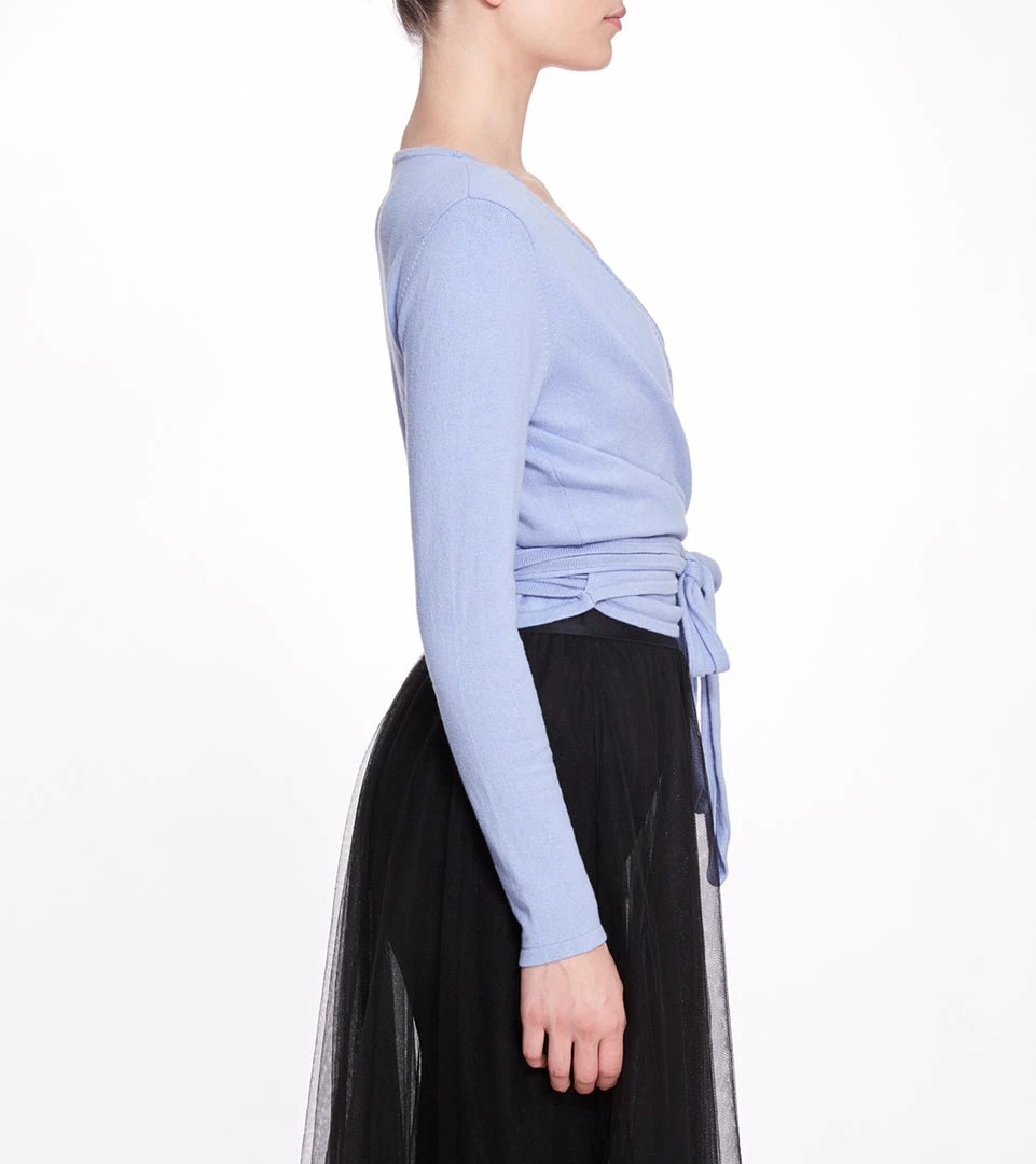The Anne Wrap Sweater features soft, light weight fabric with long sleeves, deep v-neckline, and thick wrap tie.Â