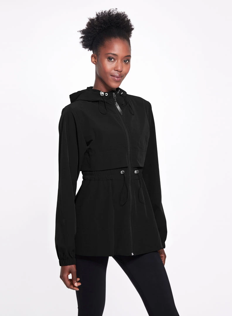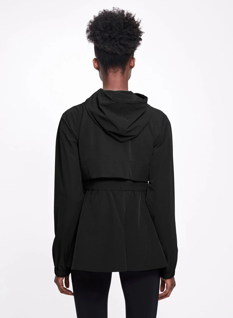 Lightweight bonded stretch nylon athletic running jacket with woven interior texture, drawstring detail at waist, side seam pockets, front zip, and tiered shape with hood.Â