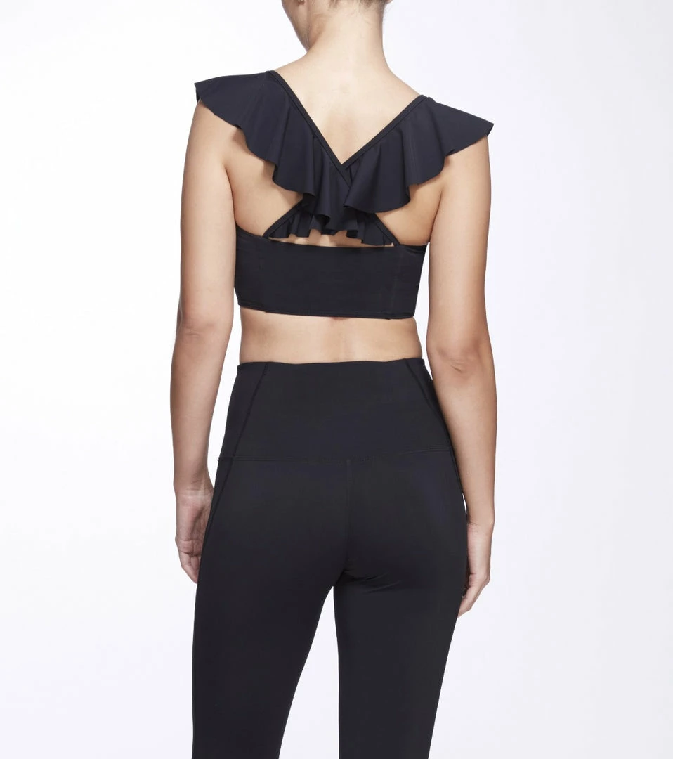 The Crystal Bra features a scoop neckline and ruffled straps that cross in the back. Lightweight and smooth compression fit, ruffle detail, super smooth performance fabric.