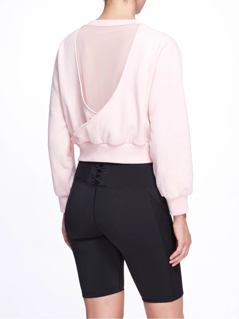 The Wilma Sweatshirt features super soft fleece jersey, crew rib neckline with embroidered bow detail, dropped shoulder, long sleeve with blouse effect, relaxed cropped fit.