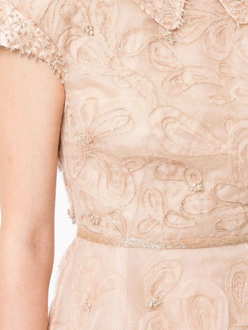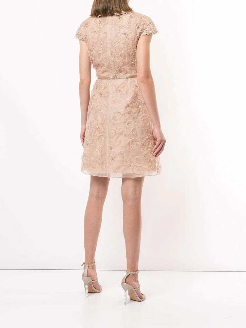 A collared, cap sleeve cocktail dress with a shift silhouette, an abstract pattern, beaded embroidery, a cinched waist, a round neck, a back zip fastening, short sleeves, and a short length in blush.