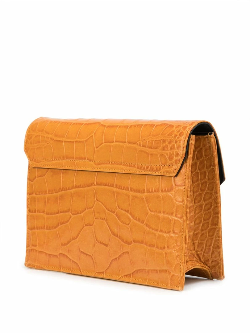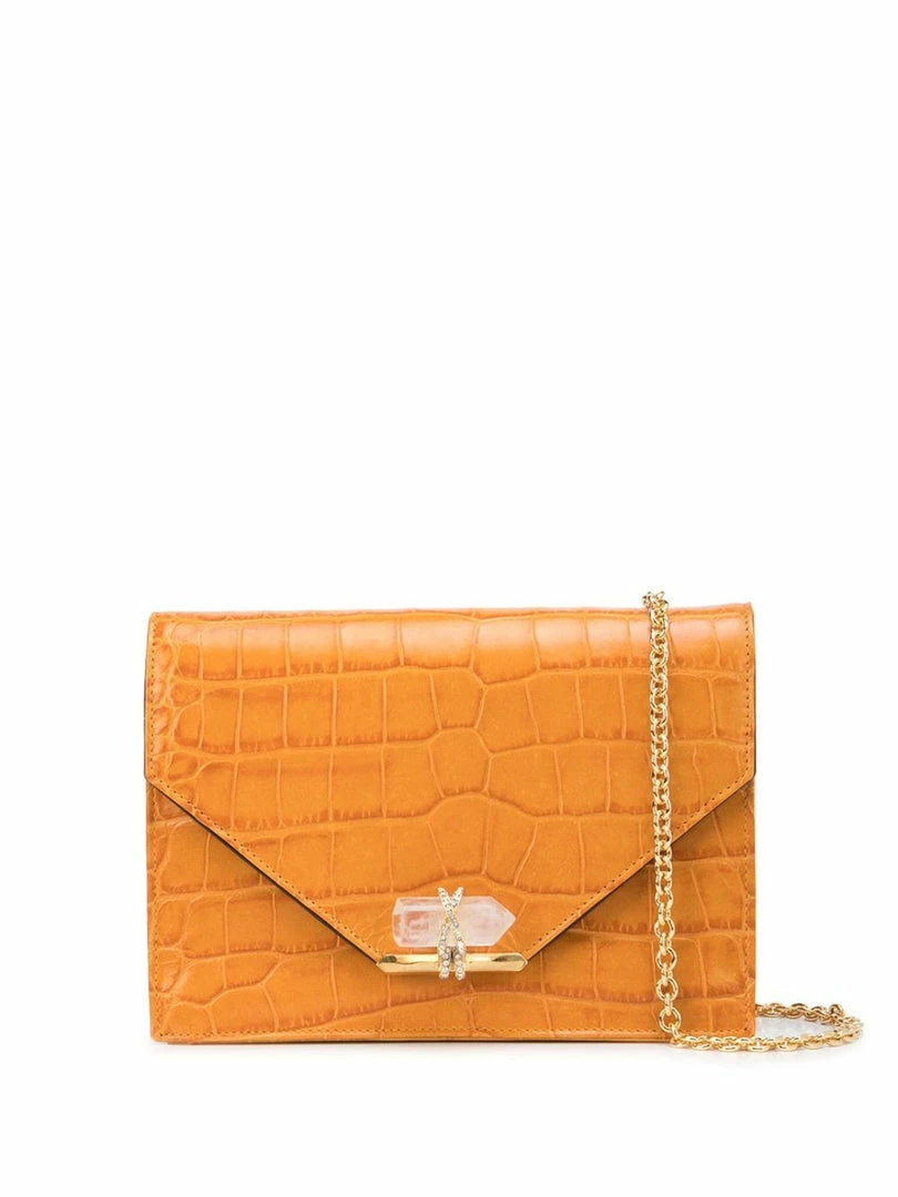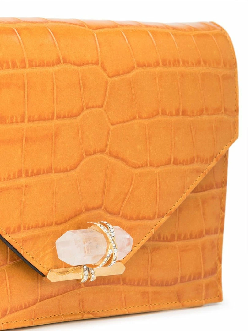 This crossbody handbag is the perfect accessory to every outfit. Pair this textured leather beauty with an evening gown, a day dress, or a work outfit. It is the perfect transition piece, holding up well during all seasons. The golden chain shoulder strap is removable, so this bag can also be used as a clutch. It features a custom quartz crystal closure to ensure its security.Â