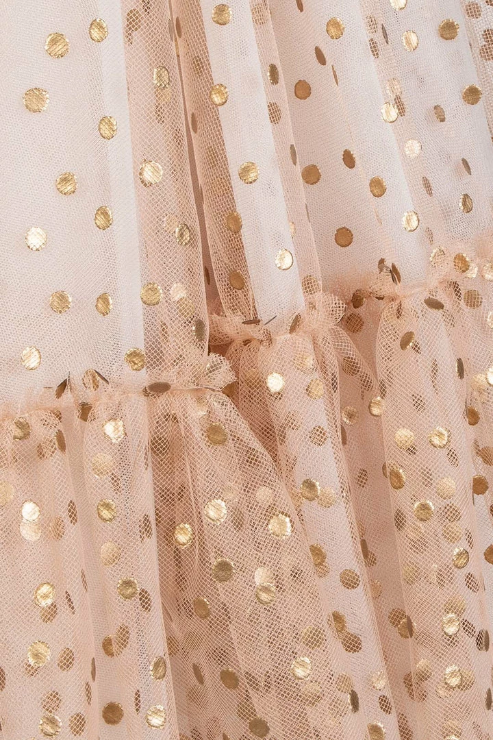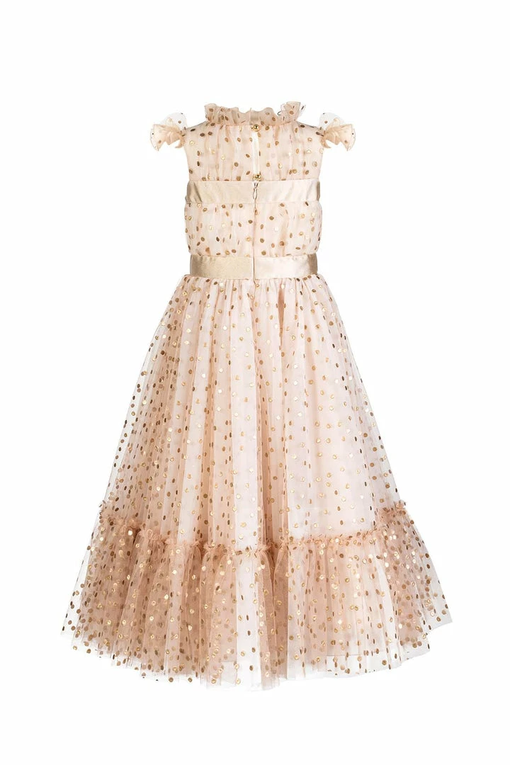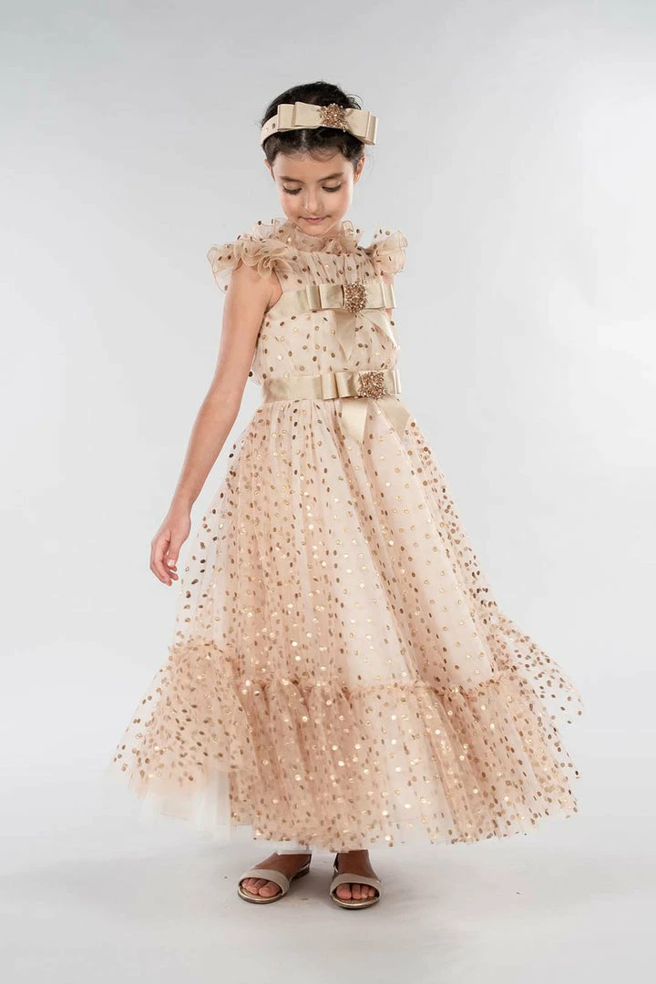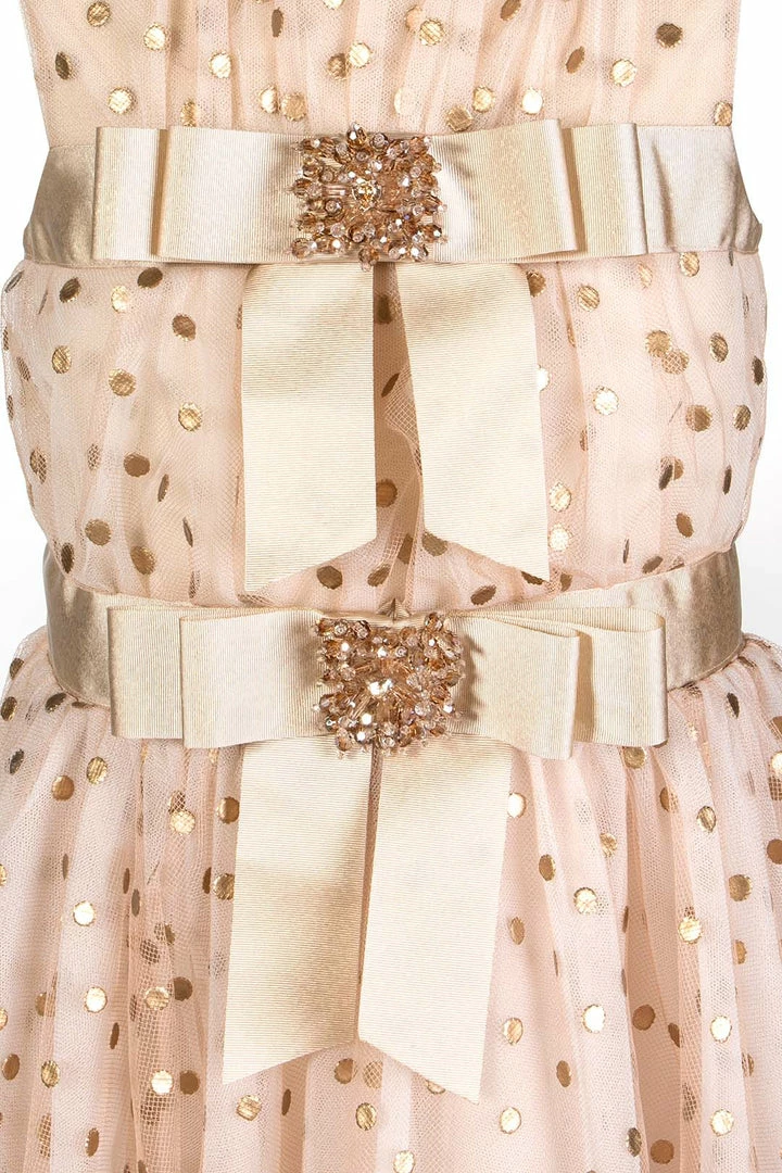 Crystal Embellished polka dot tulle gown with gold satin bow waist detail.