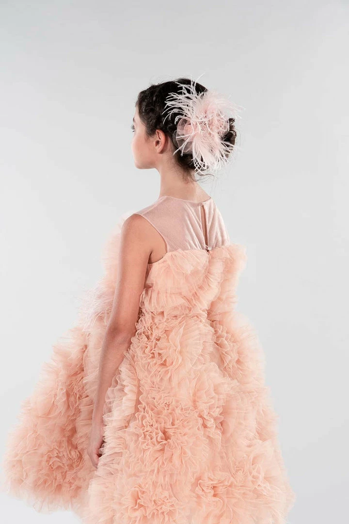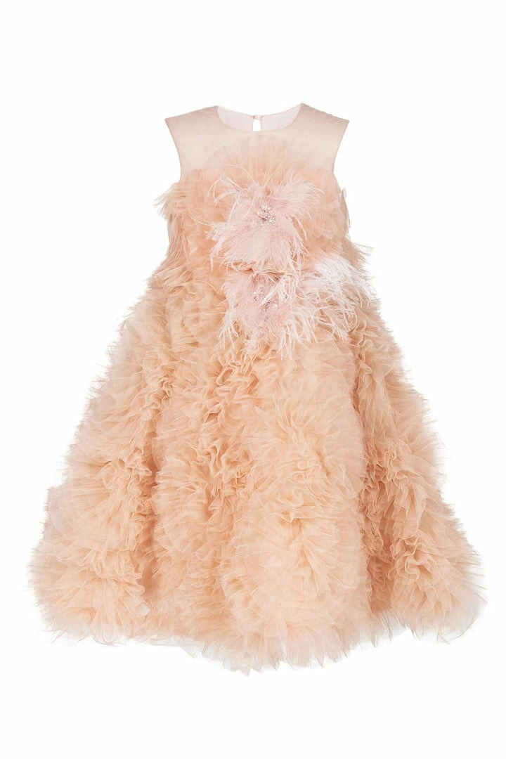 Three-dimensional rose pattern embellished tulle gown with 3D flower and feather appliqués.Â