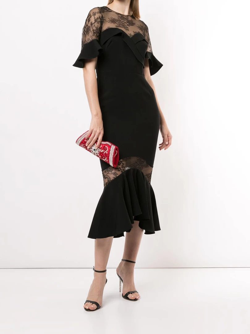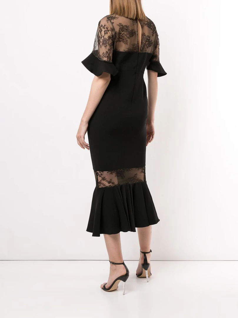 Cocktail dress featuring 3/4 length bell sleeves, delicate lace details, a mermaid silhouette and a ruffled asymmetric hem.