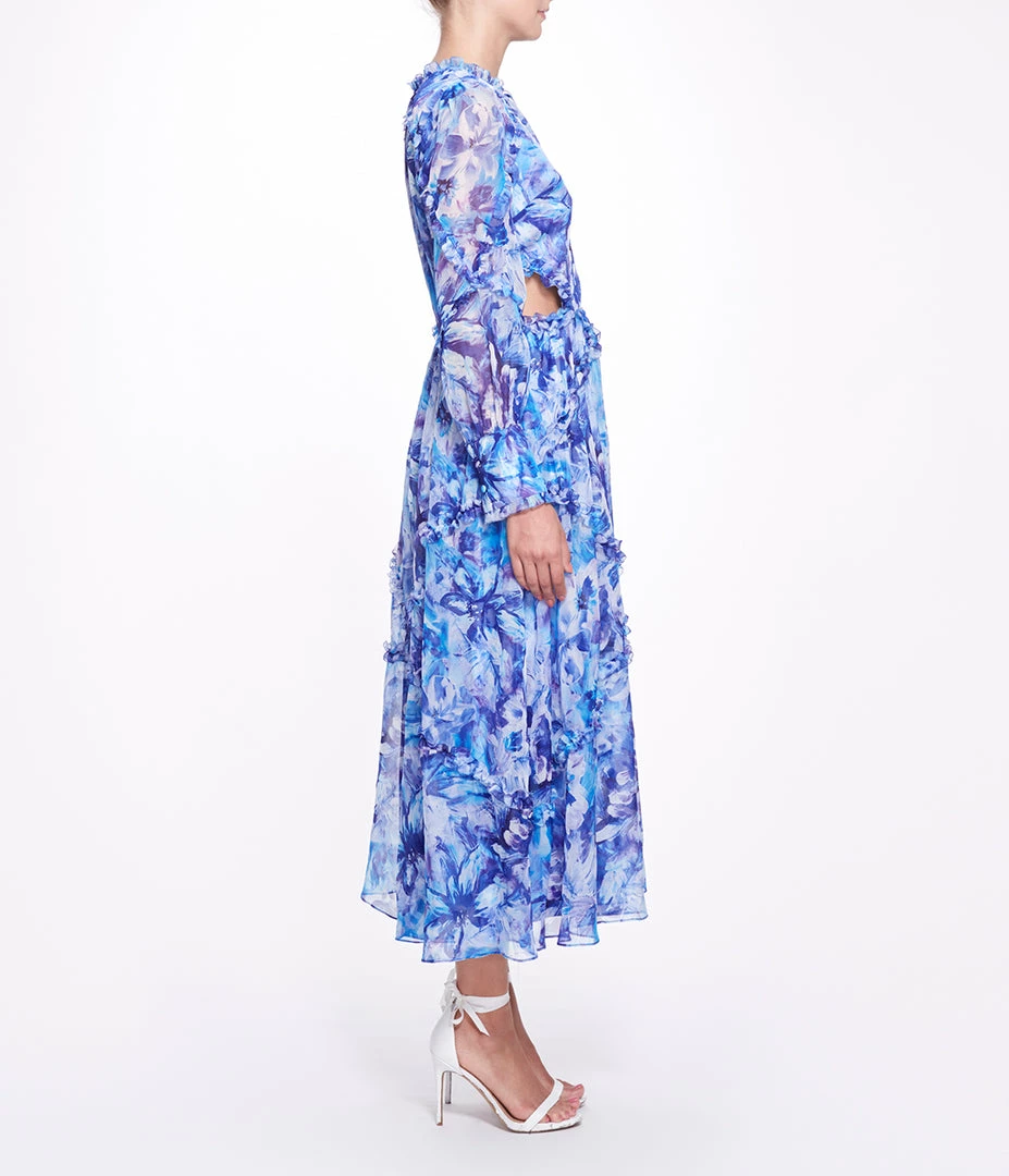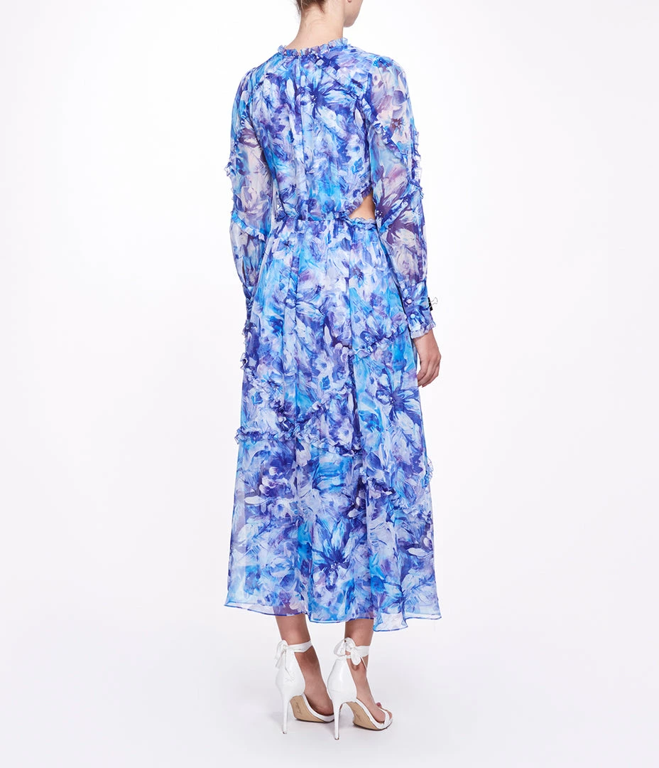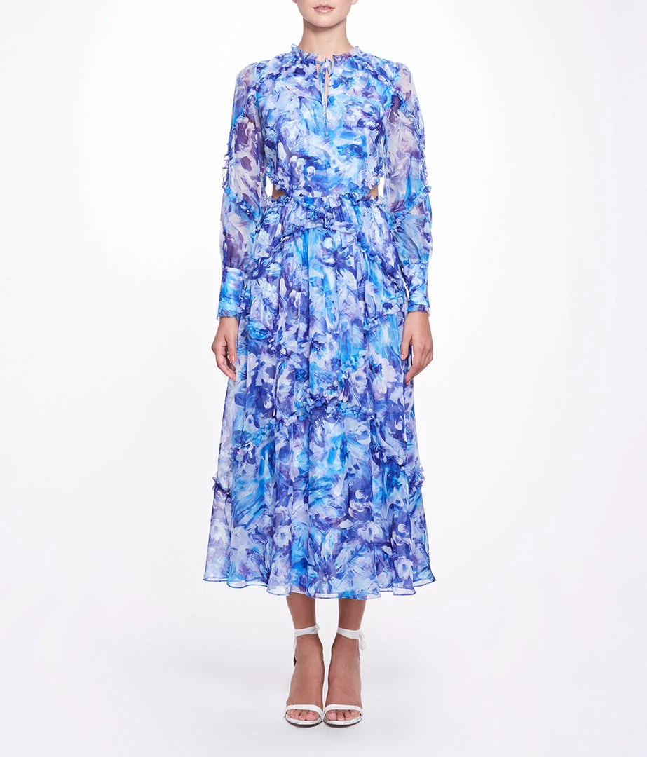 Abstract floral printed chiffon long sleeve A-line maxi dress with waist cutout, full bishop cuffed sleeve, interlacing ruffle detail and center front keyhole with tie