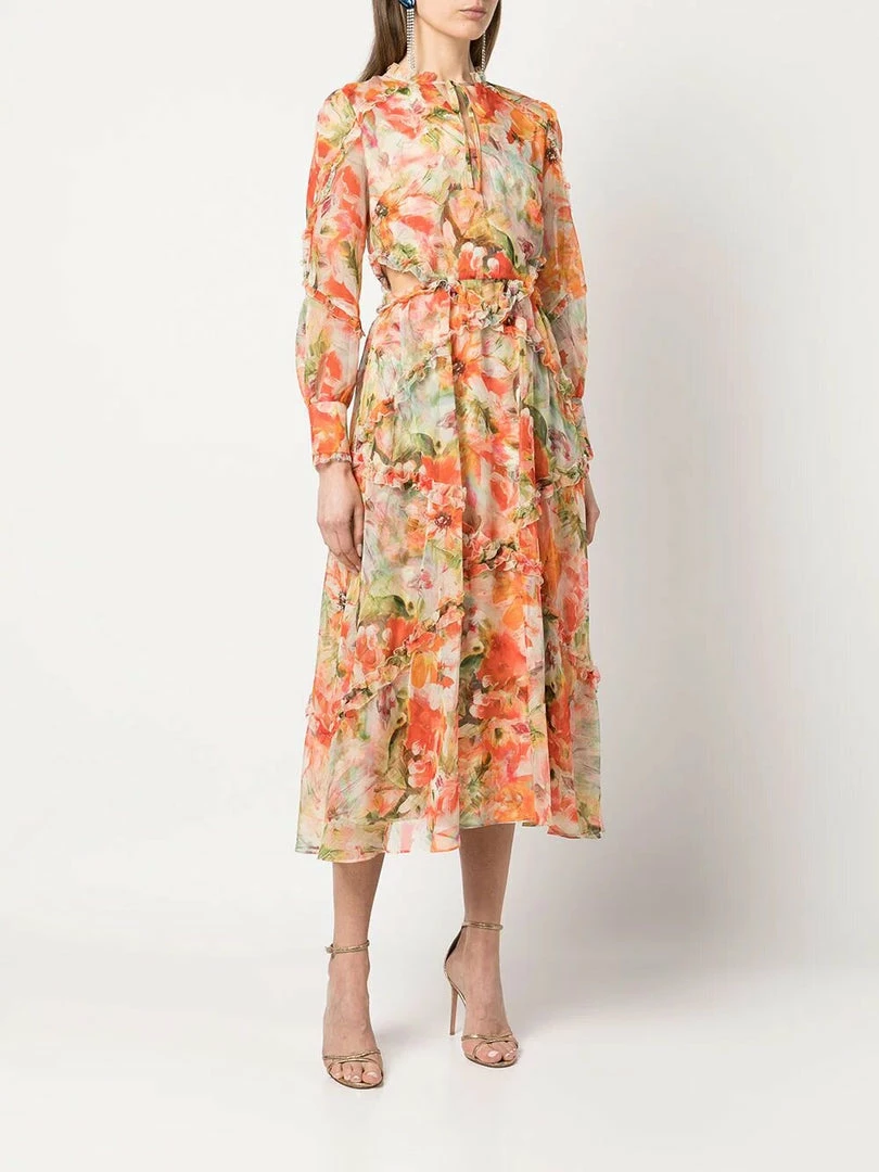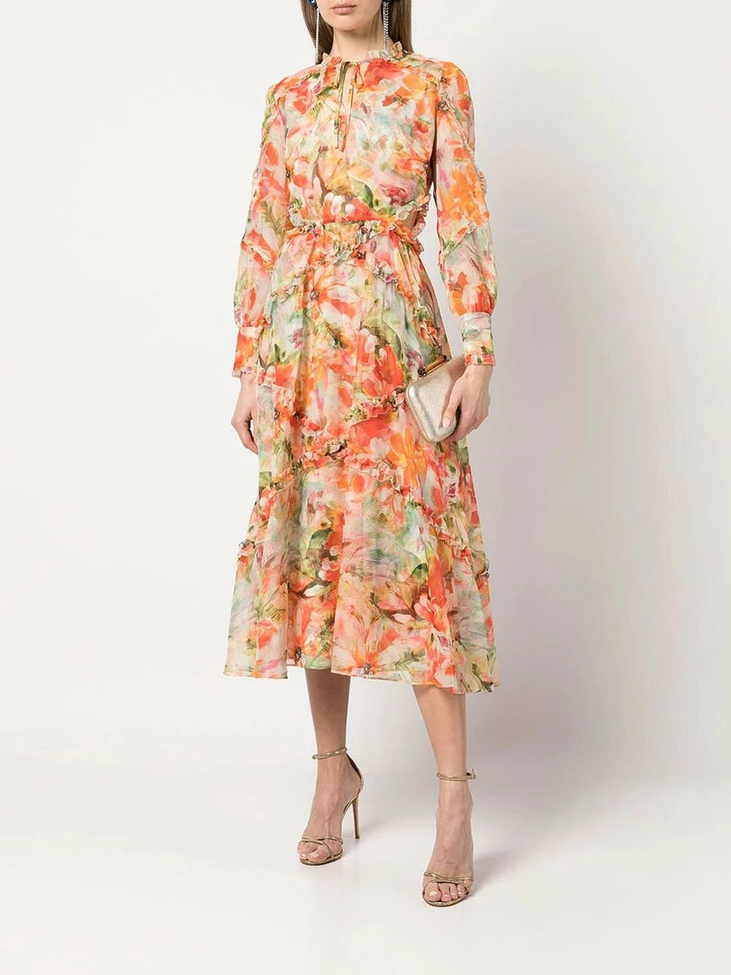 Abstract floral printed chiffon long sleeve A-line maxi dress with waist cutout, full bishop cuffed sleeve, interlacing ruffle detail and center front keyhole with tie