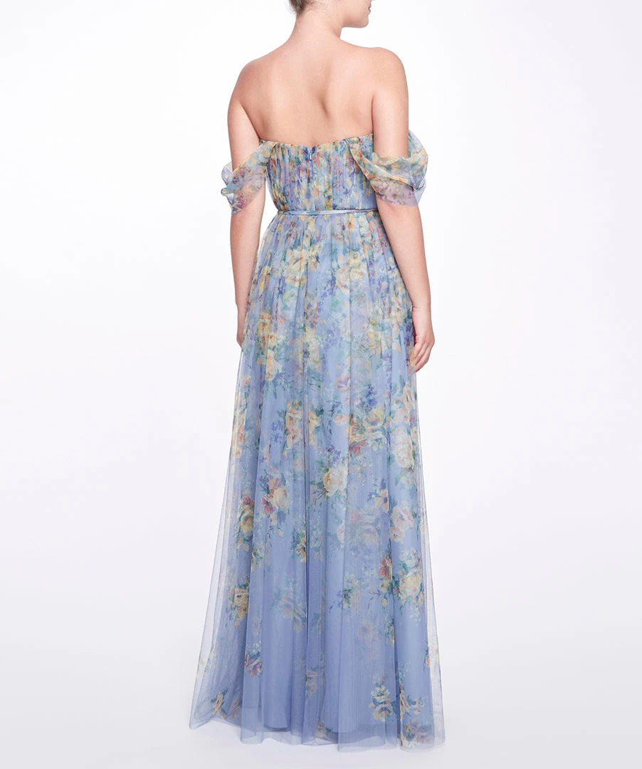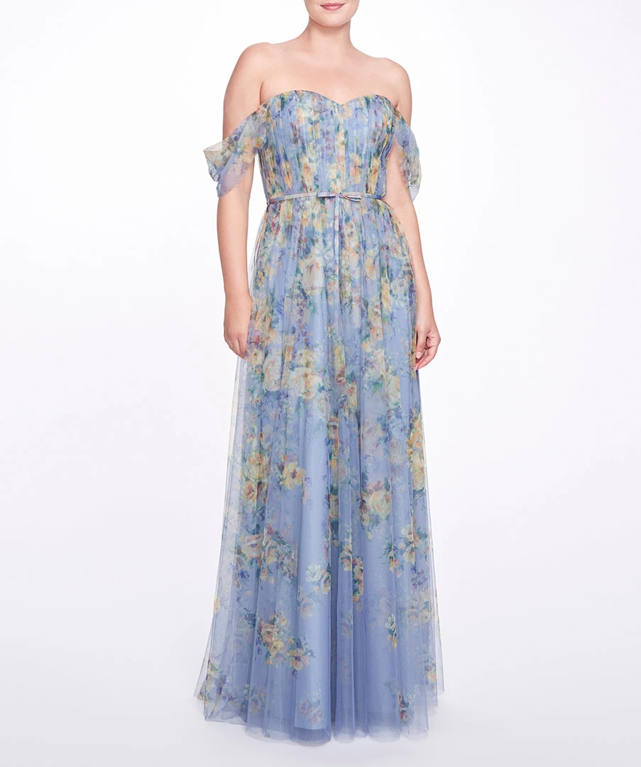 AlessandriaĀ full-length gown is enchanting for any occasion.Ā Featuring printed chiffon, a graceful off the shoulder design, andĀ a cinched waist with a dainty bow.