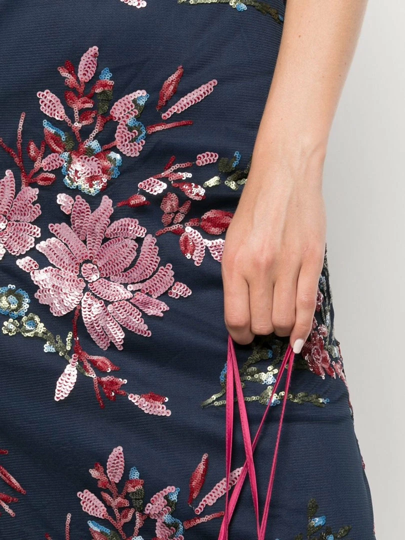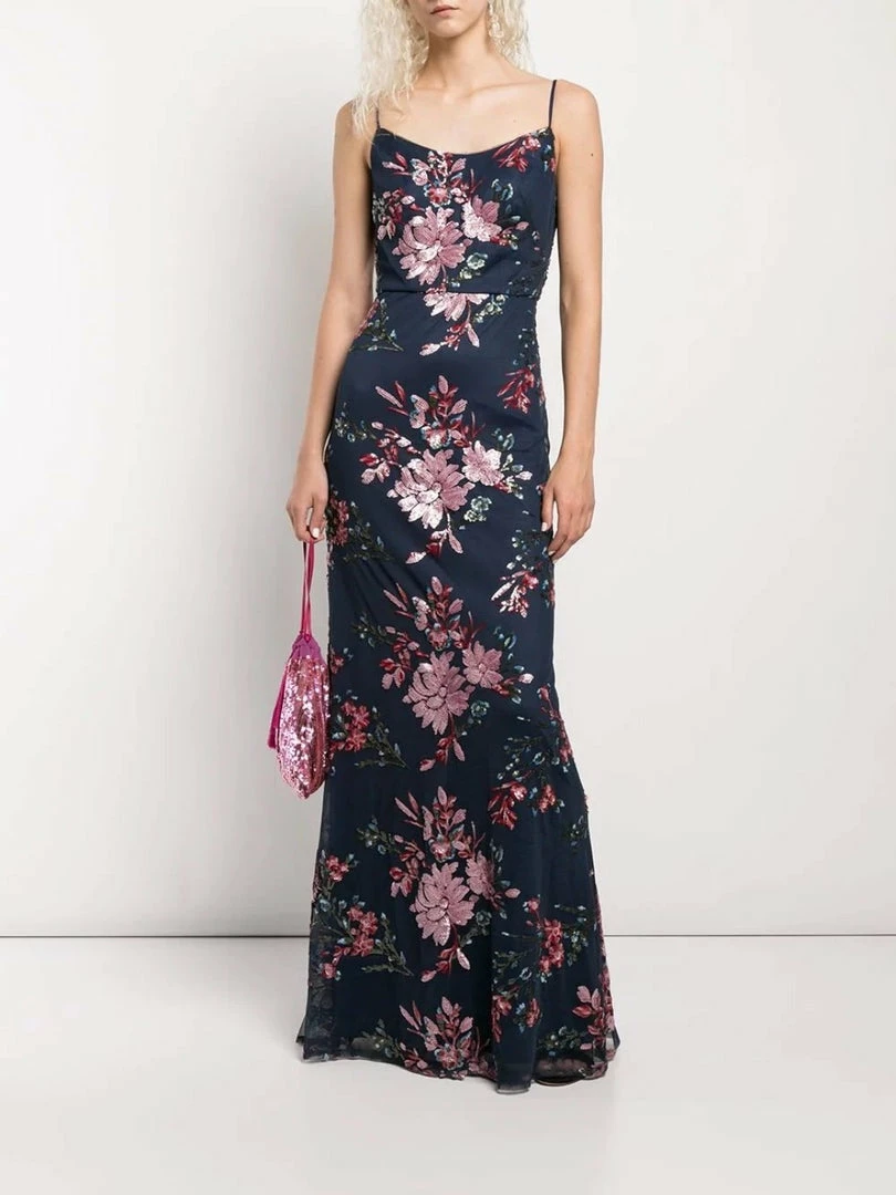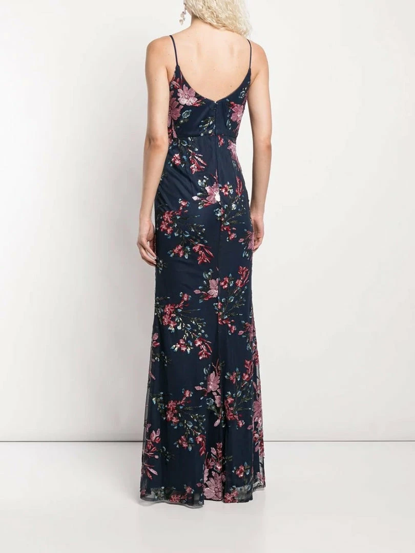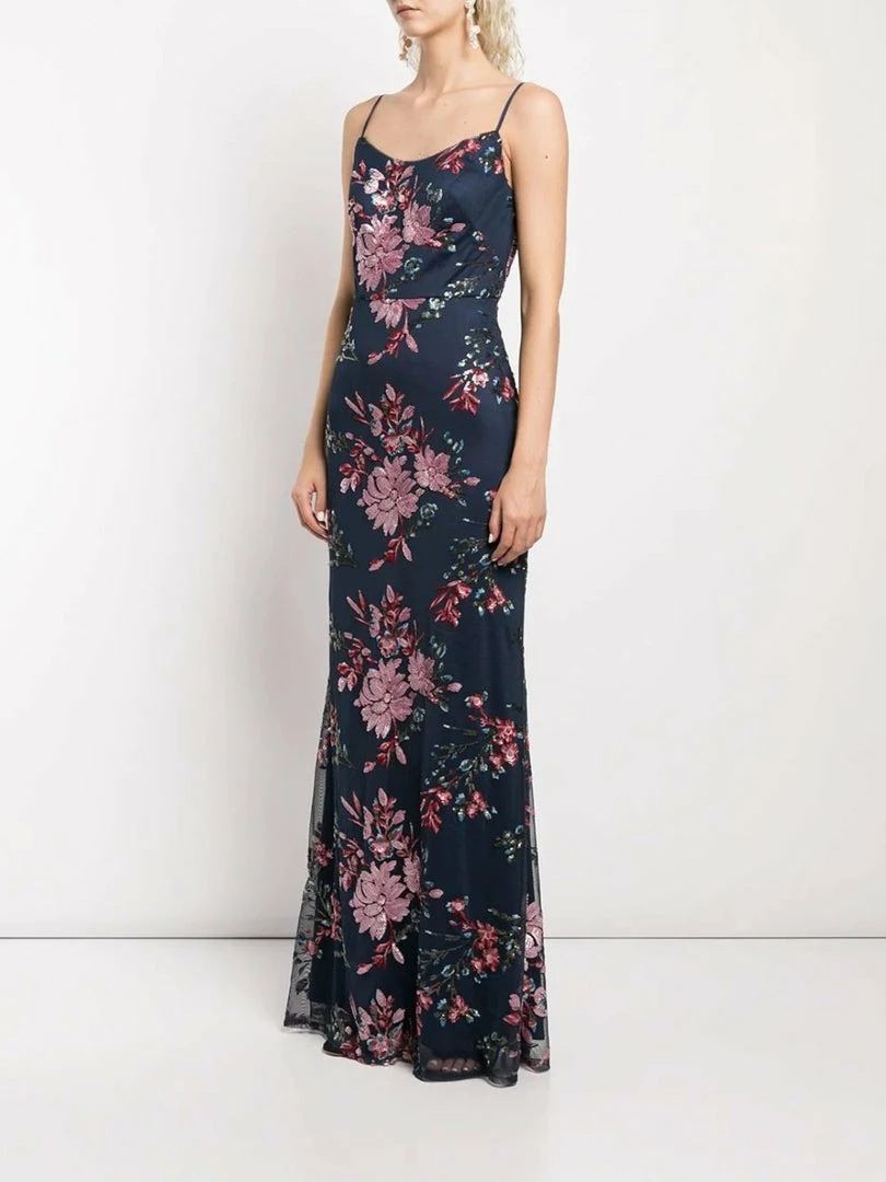 Illuminate the night in the Amalfi Printed full-length gown, featuring luminous multicolor floral sequins, an elegant scoop-neck, and a capturing open back.