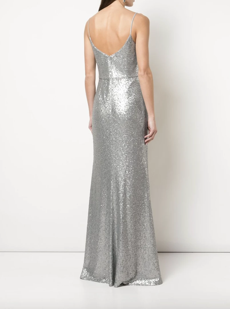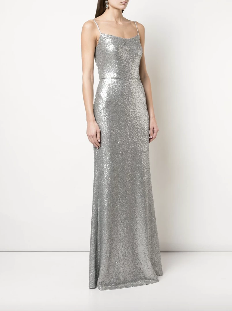 Illuminate the night in the Amalfi full length, silver sequined gown, featuring luminous sequins, an elegant scoop-neck, and a capturing open back.Â