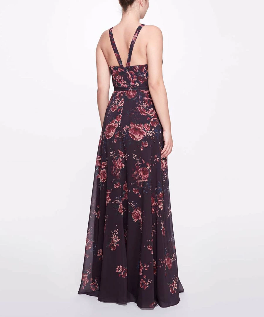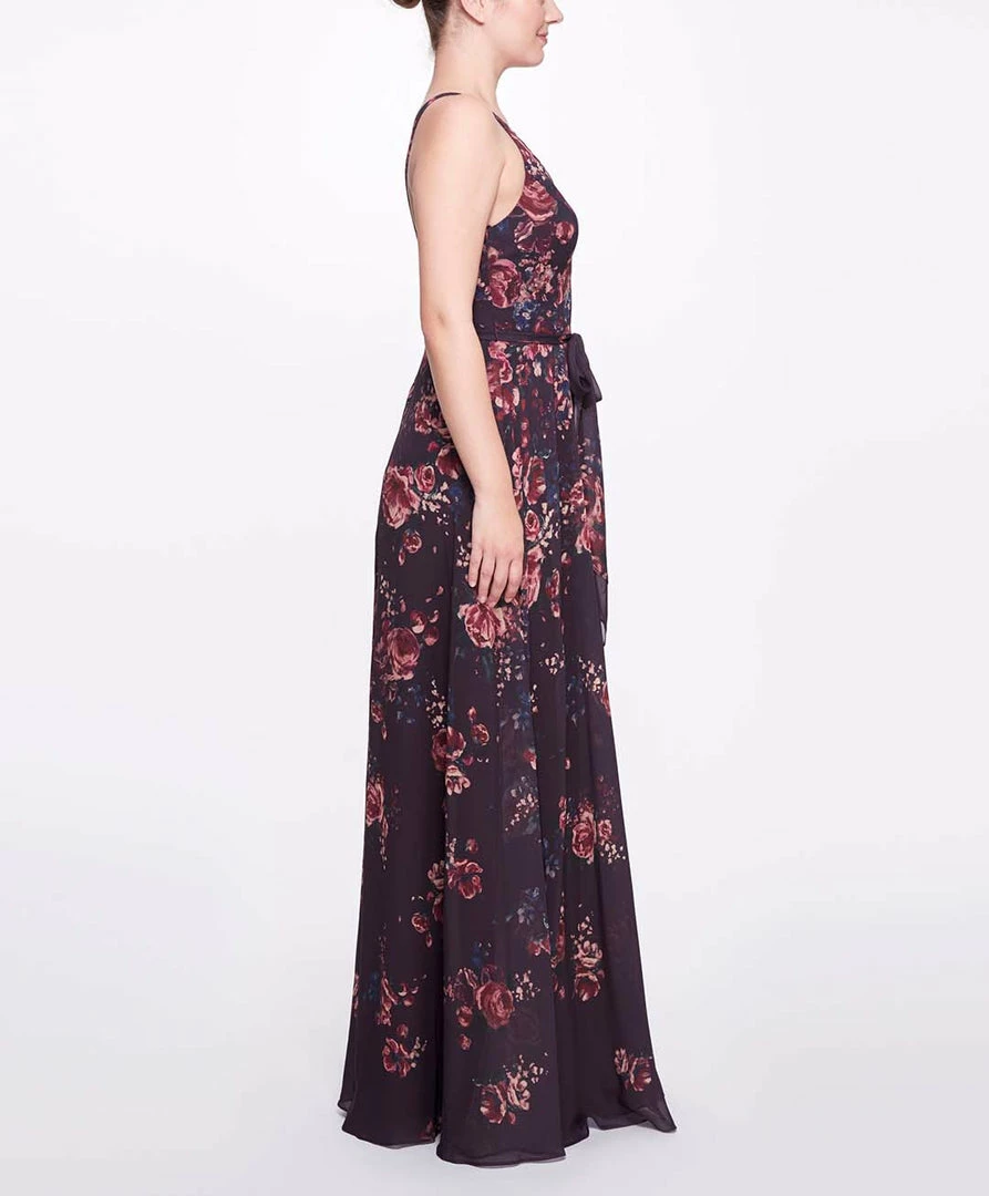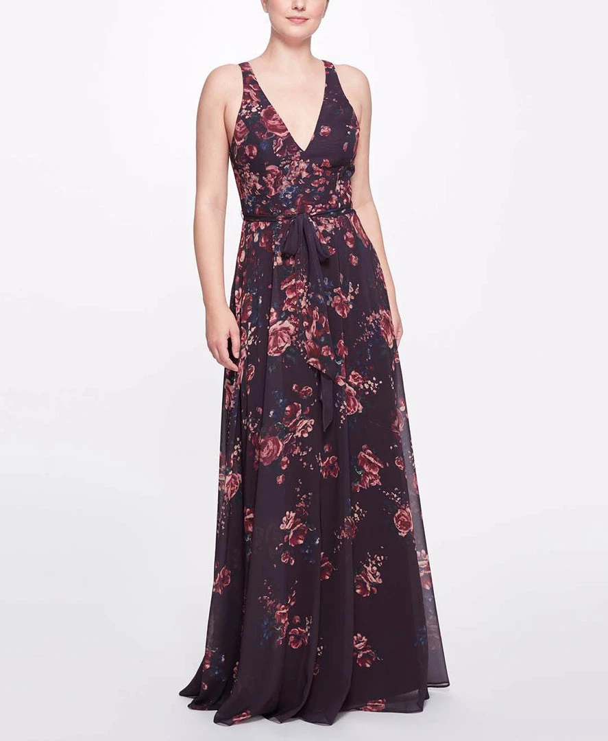 Bloom all year round in the Aprilia Printed full length v-neck, deep purple floral chiffon gown. Featuring a romantic floral print, a graceful cinch waist tie, and a charming double strap at the back.