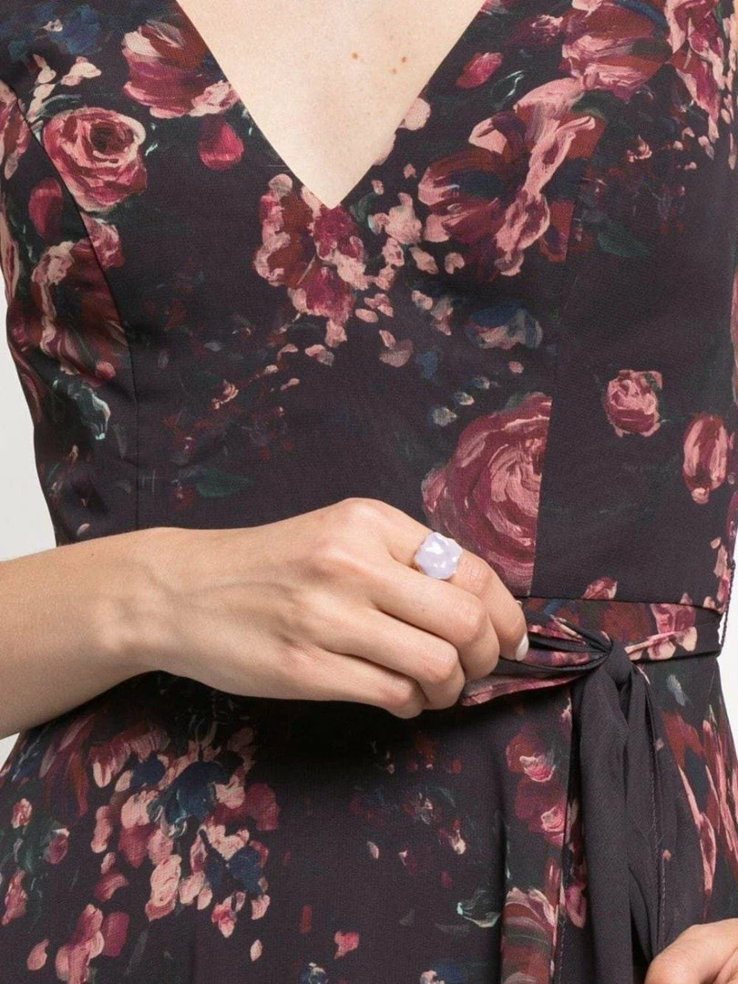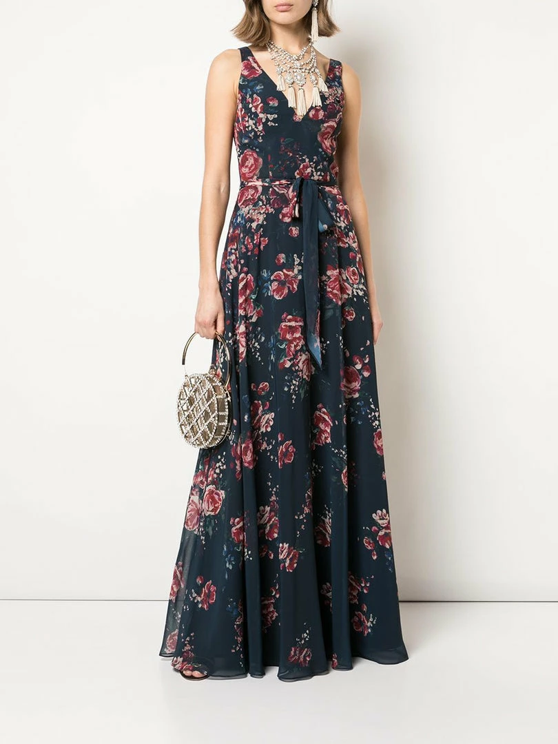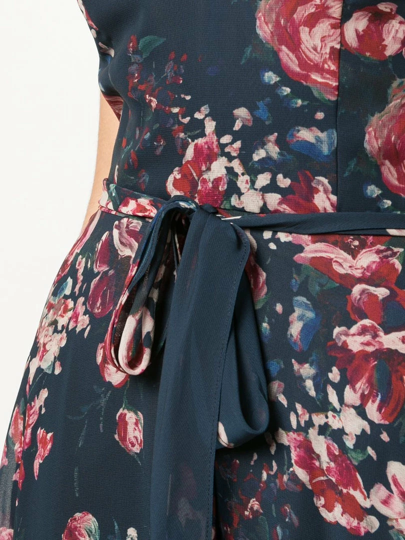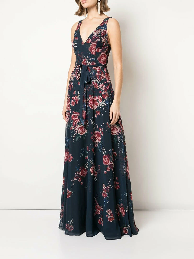 Bloom all year round in the Aprilia Printed gown. Featuring a romantic multicolor navy and jewel floral print, a graceful cinch waist tie, and a charming double strap at the back.
