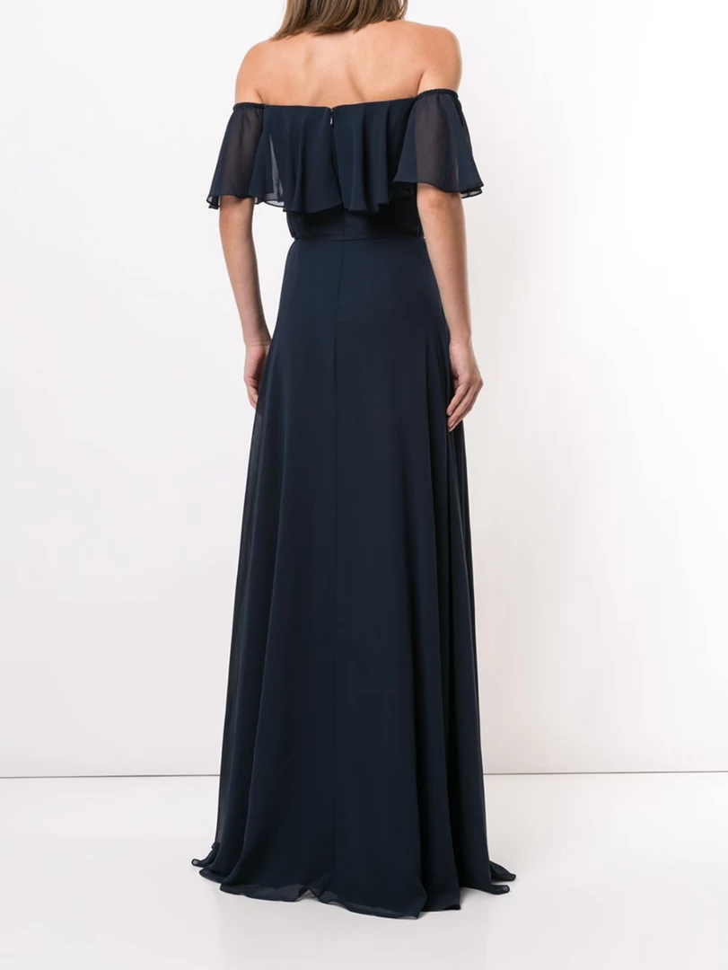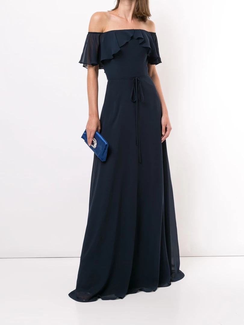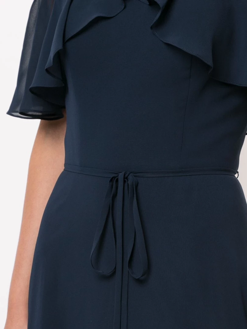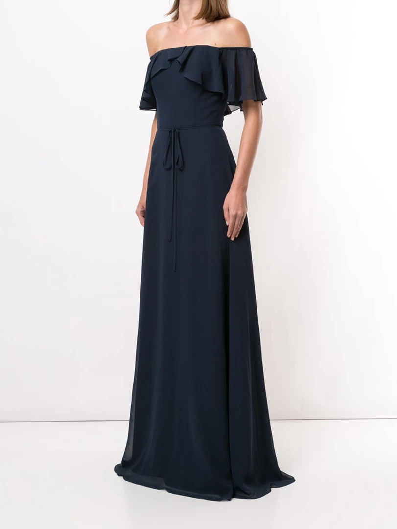 Step out in the effortless Augusta chiffon gown in midnight navy blue. Featuring a striking hue, a flirtatious multi-option short flutter sleeves,  and charming cinched waist.
