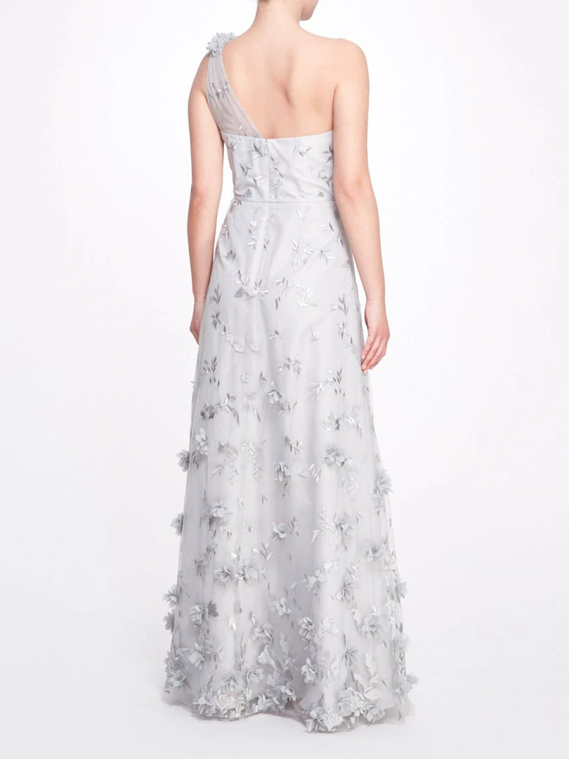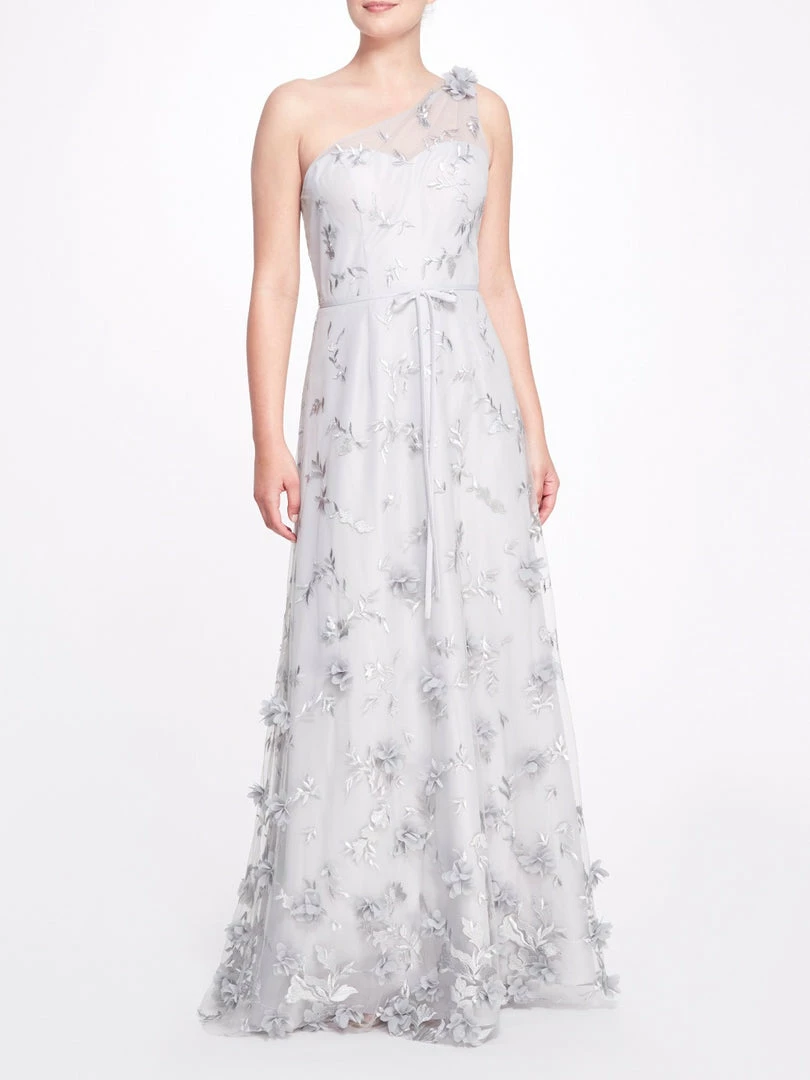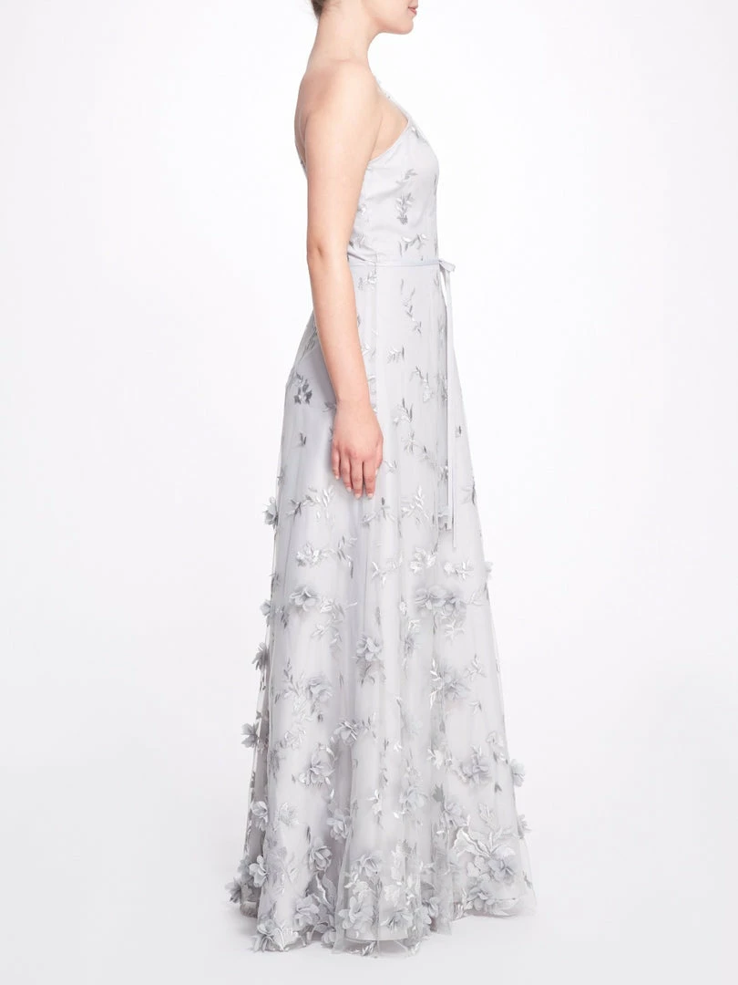 The Bari gown in dove grey features a sweetheart neckline with a tulle one-shoulder overlay, a dainty tie waist, and sprawling 3D floral appliqués.
