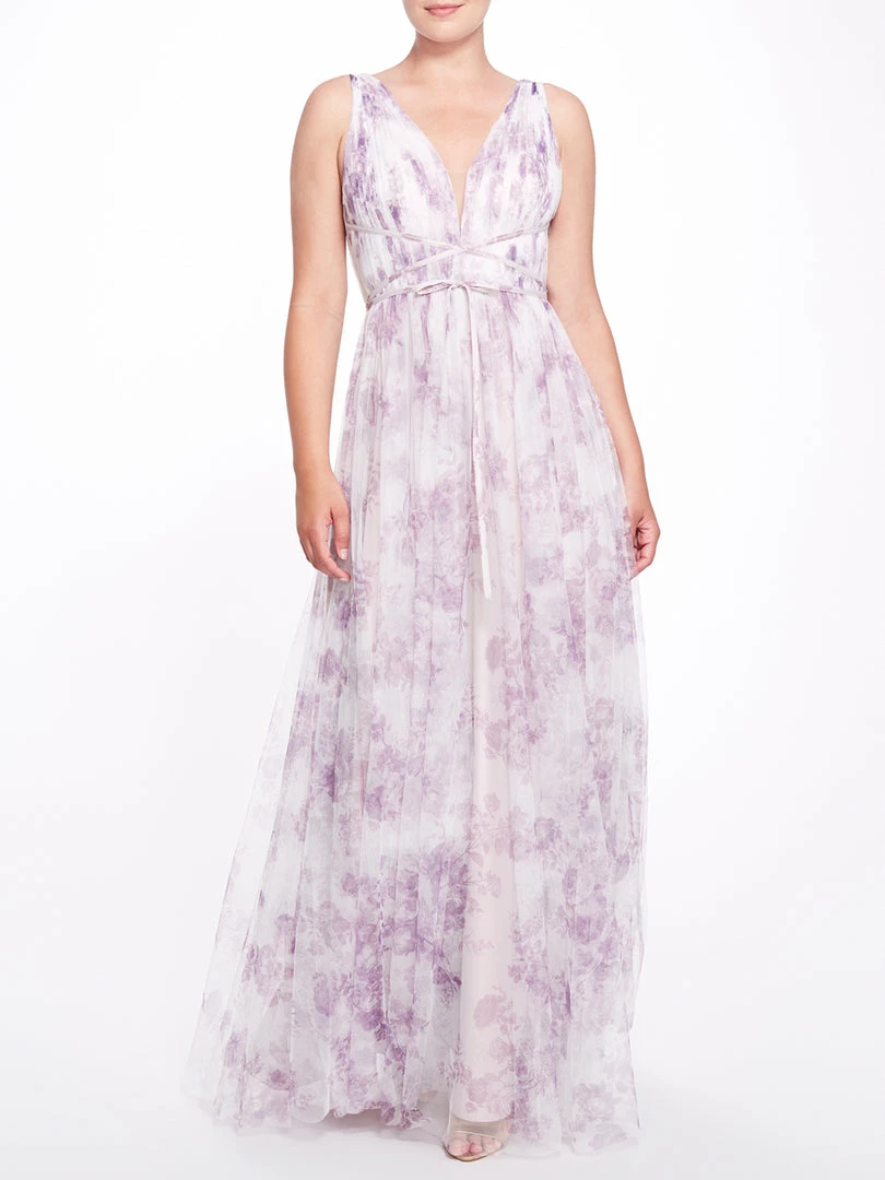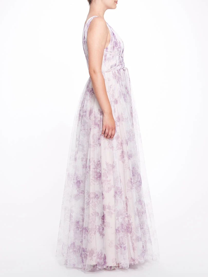 The Biella Printed gown in lilac features a glamorous ruched tulle v-neck gown, adorned with porcelain print and a ribbon wrap detail.