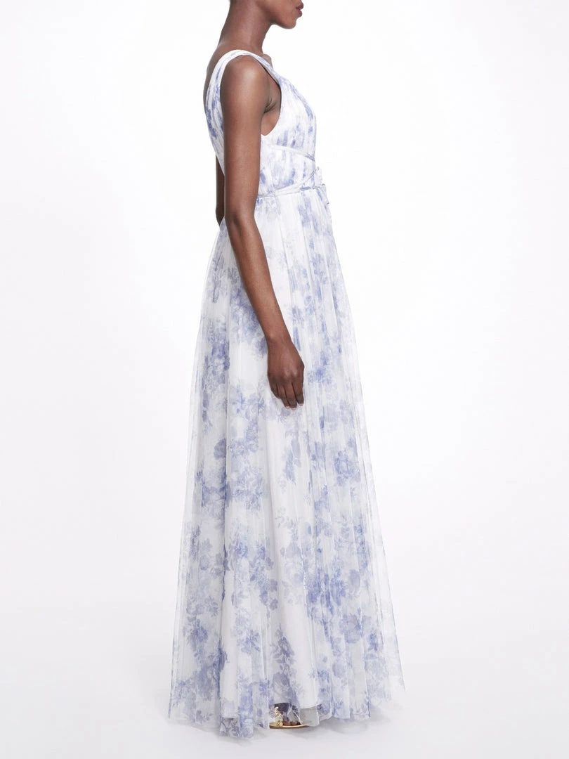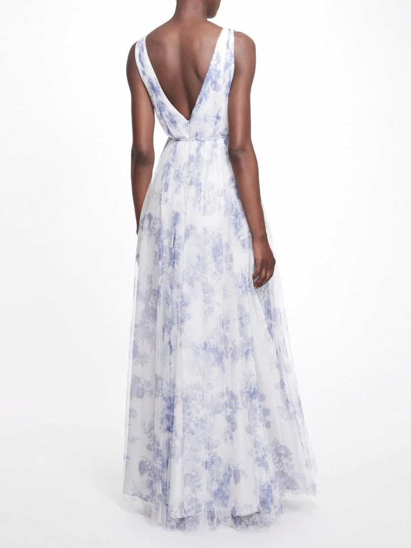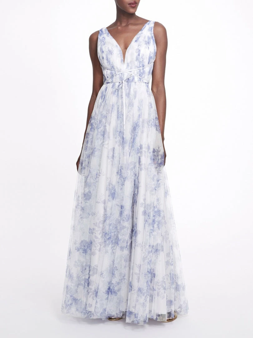 The Biella Printed gown in blue features a glamorous ruched tulle v-neck gown, adorned with porcelain light blue and white print and a ribbon wrap detail.