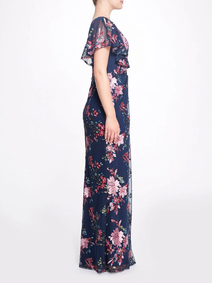 A romantic, sweeping gown, the Brescia features a one-shoulder neckline, ruffle sleeve, long bodice, and tie waist.