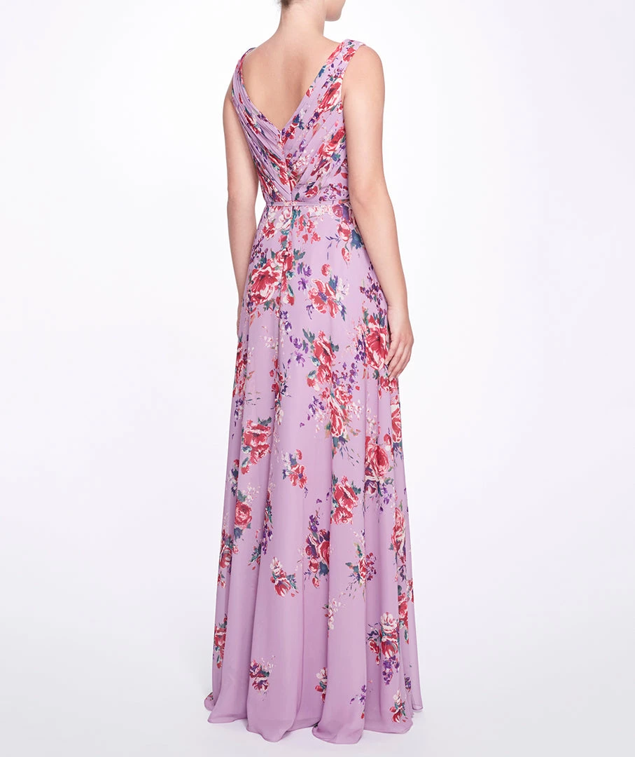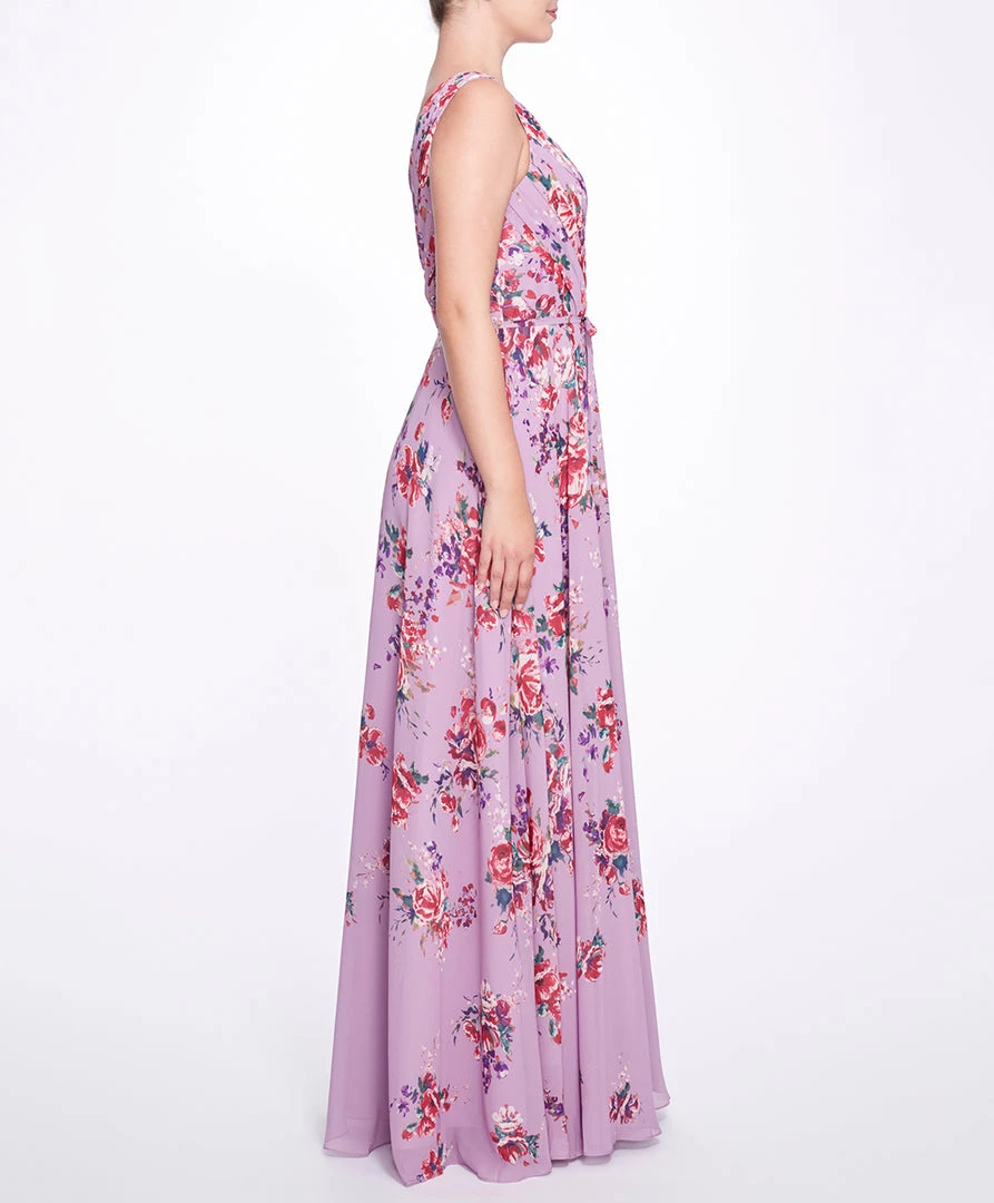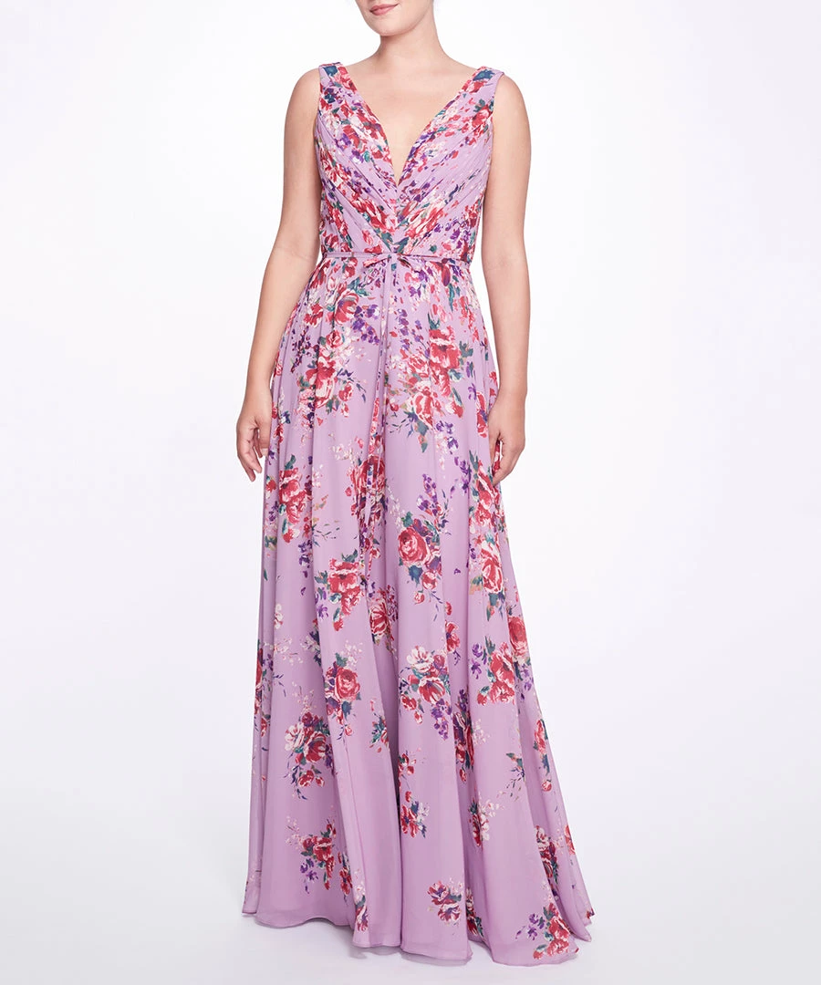 Complete your look with Brindisi gown in jewel lavender. Featuring a romantic floral print, a deep v-neck, and a charming open back design, and and a cinched waist with a dainty bow.