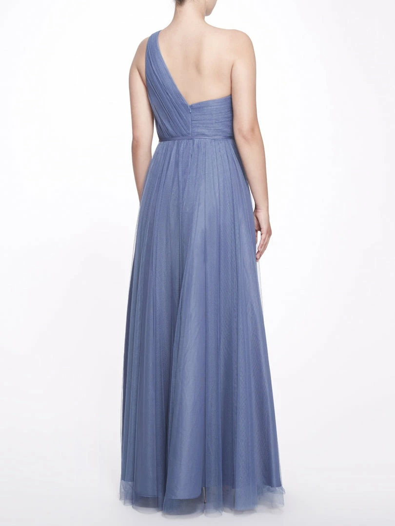 Become an irresistible combination of sophistication and romance in the Capri gown in slate blue. Featuring an attractive neck detail and elegant open back.