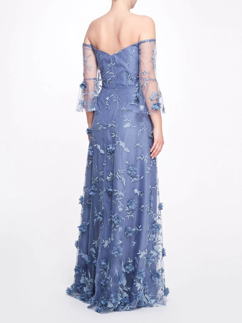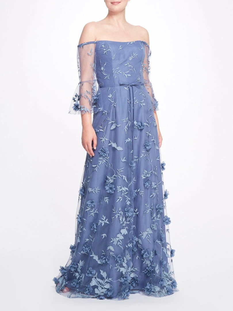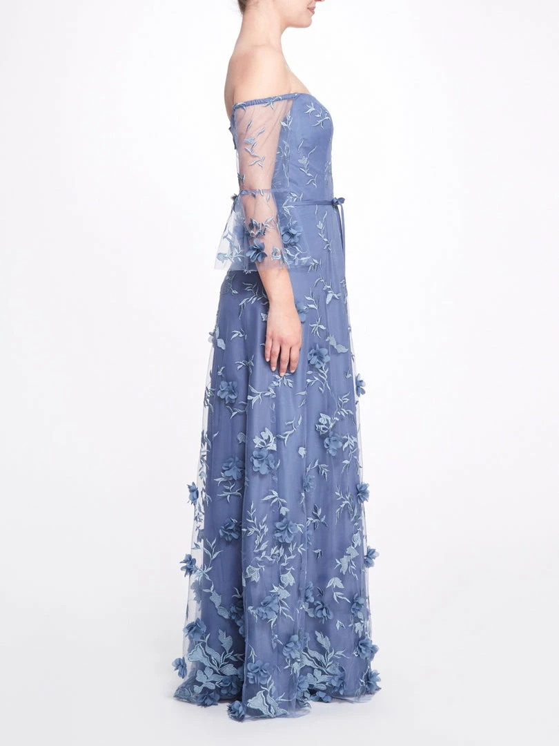 The Cataria gown in slate blue features an off-the-shoulder bodice with a three-quarter wizard sleeve and tie waist, all adorned with 3D floral appliqués.
