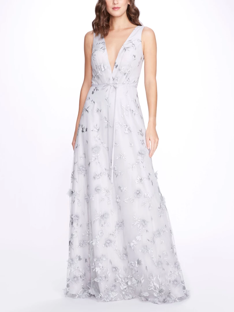 The Cesena gown features an amorous bodice, a floral pattern, a soft neckline, and a lush ribbon waist tie.