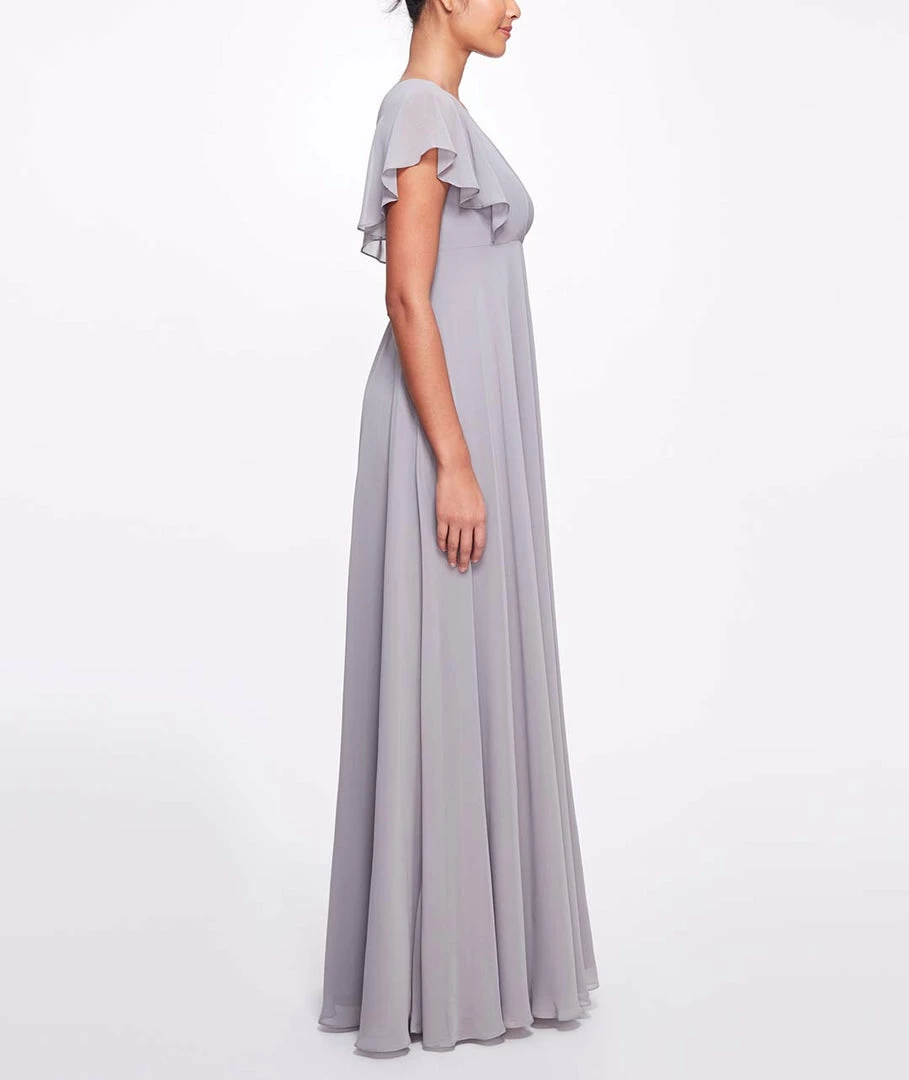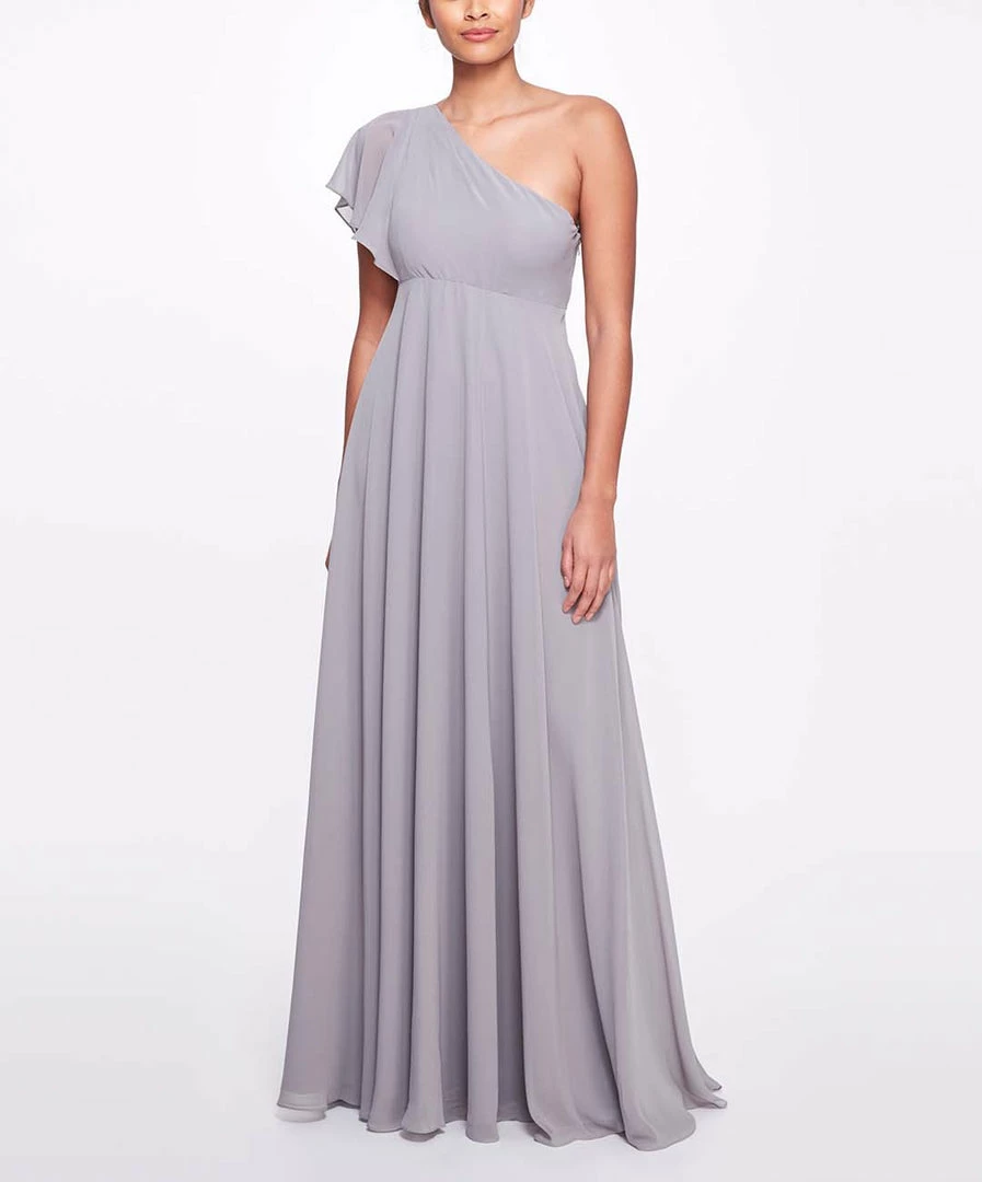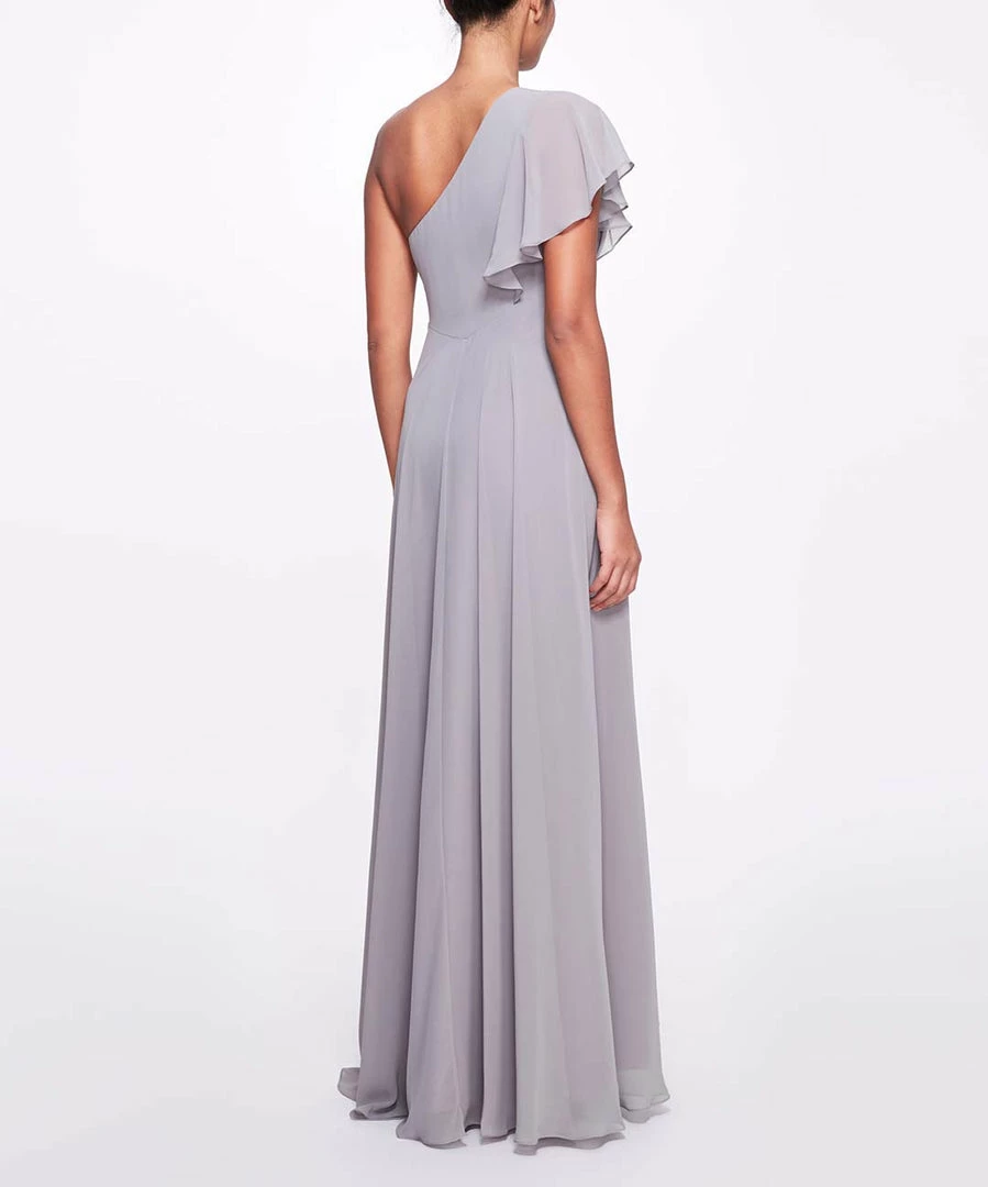 The Cremona gown features an empire waist gown with a one-shoulder design, alongside a flutter sleeve.