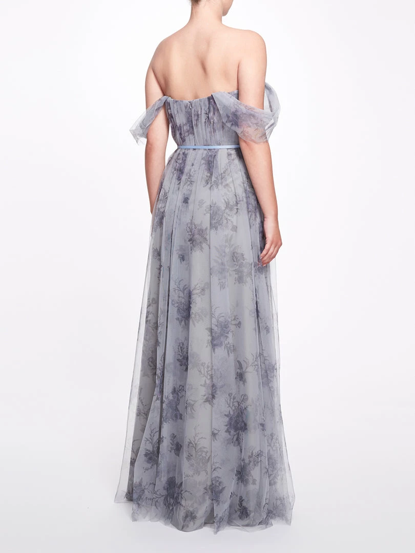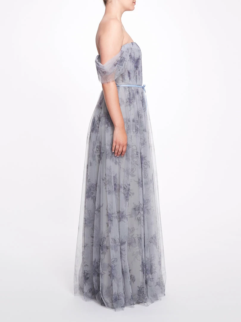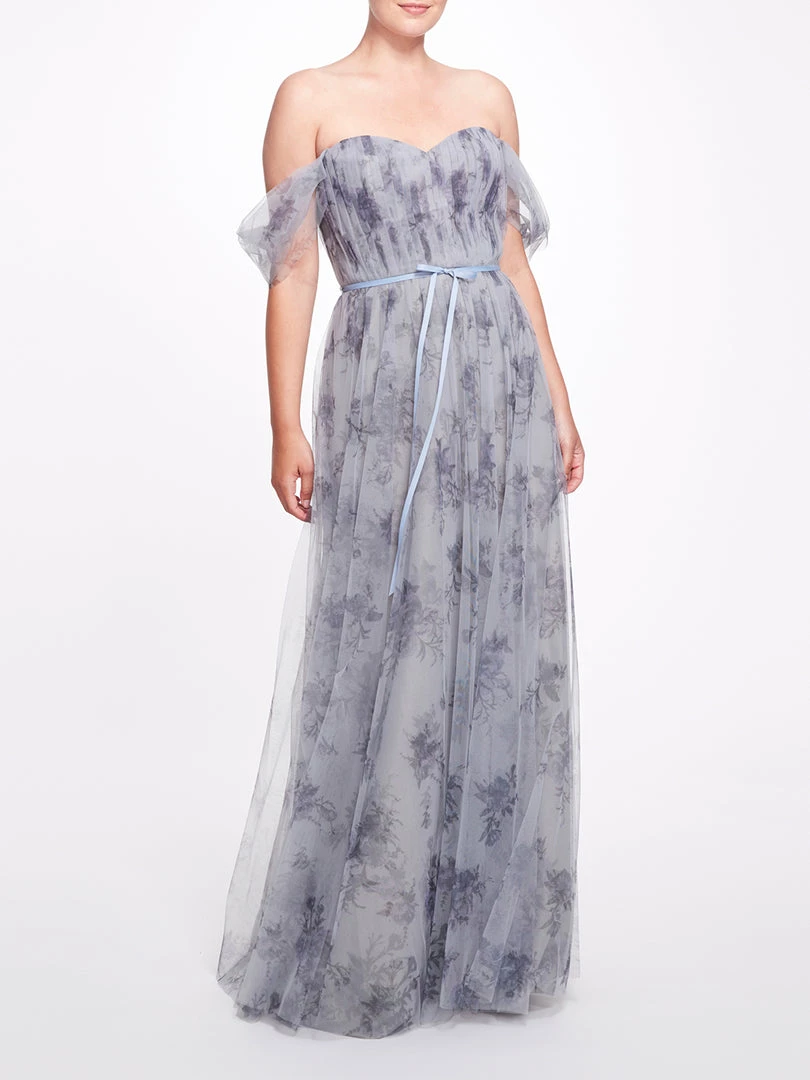 The Enna gown in Dusty Blue features draping of sheer fabric along the shoulders, a ribbon belt, a sweetheart neckline, a floral print, a long length, and dropped short sleeves.