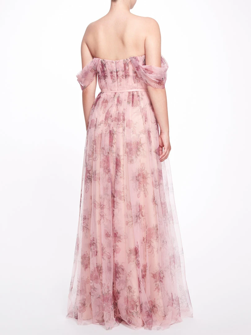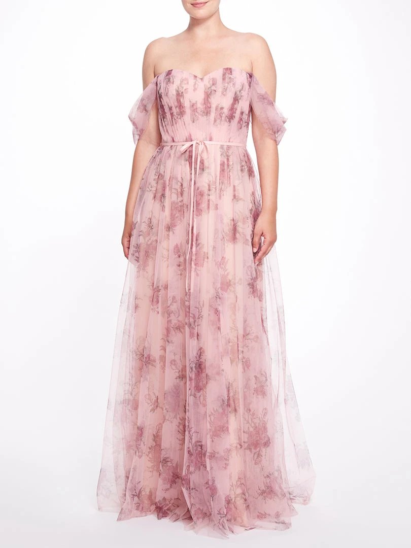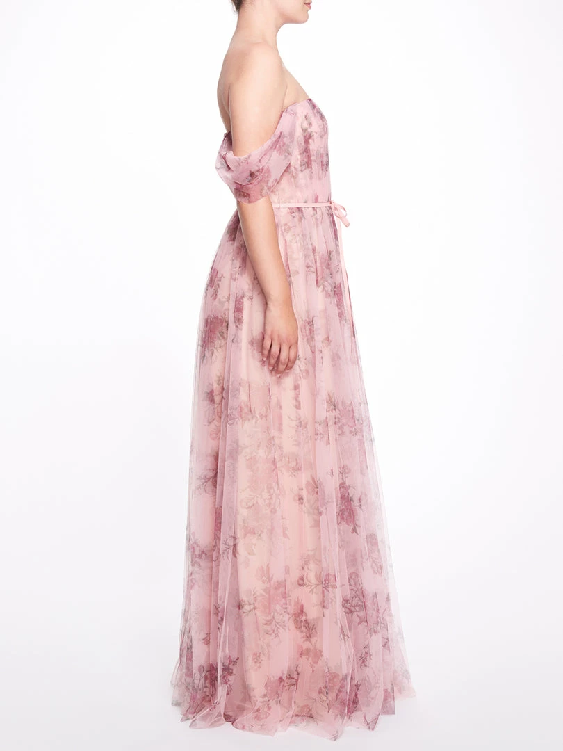 The Enna gown in Blushe features draping of sheer fabric along the shoulders, a ribbon belt, a sweetheart neckline, a floral print, a long length, and dropped short sleeves.