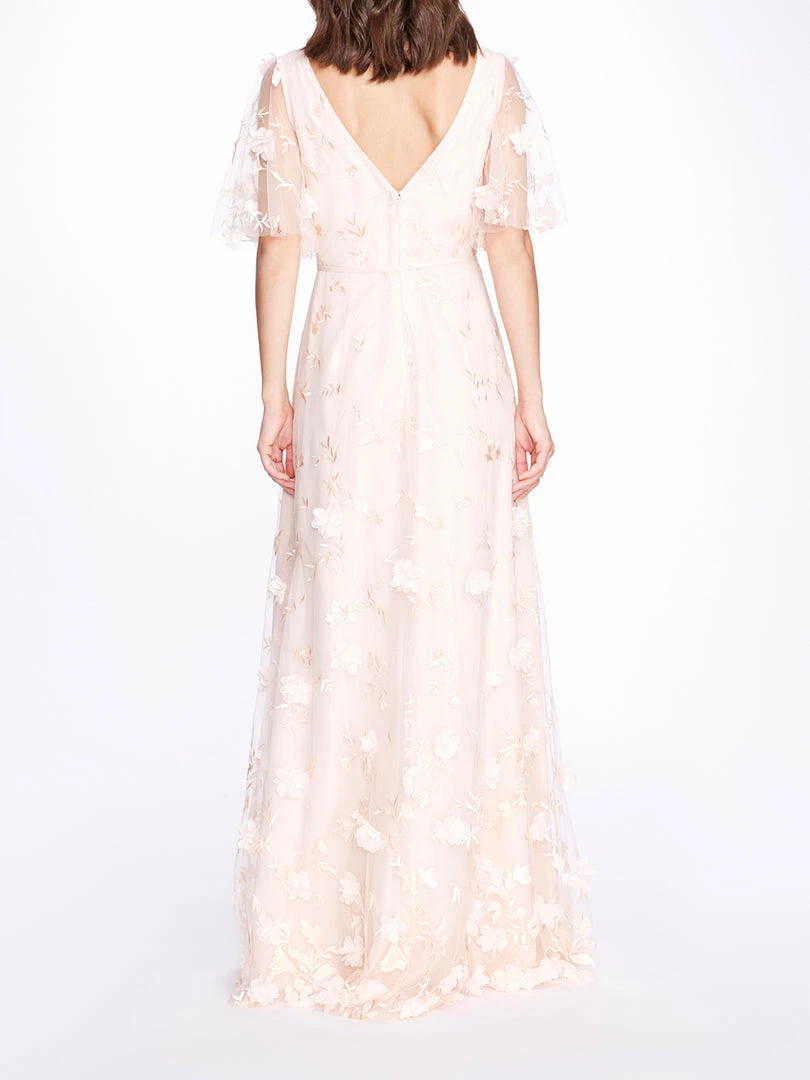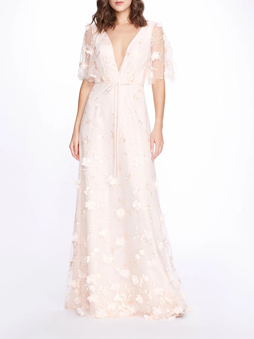 The Erice gown embodies the essence of a fairytale, featuring a plunging v-neckline, flutter tulle sleeves, a waist tie detail, and adorned with floral 3D appliqués and embroidery.